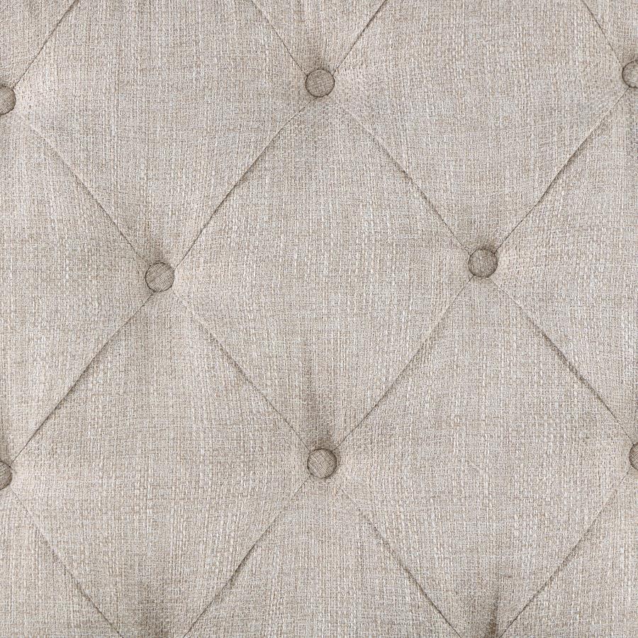 - Arched headboard with ornate trim and button tufting in soft beige fabric