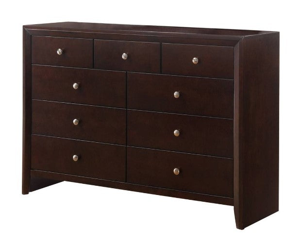 Keep your bedroom looking chic with the Evan Dresser. This stylish dresser comes in a brown finish that will complement any décor. The contemporary design fits various decors, making it a versatile piece for any bedroom. With 2-toned drawer interiors and strong English dovetail construction, this dresser is both stylish and functional. The sanded drawer bottoms protect clothing and other items, while the Kenlin metal center drawer glides will not buckle with humidity changes. The dustproof bottoms seal your case and give added strength.