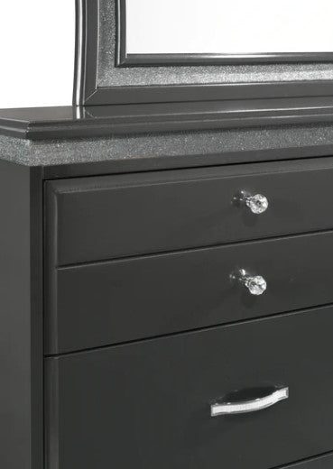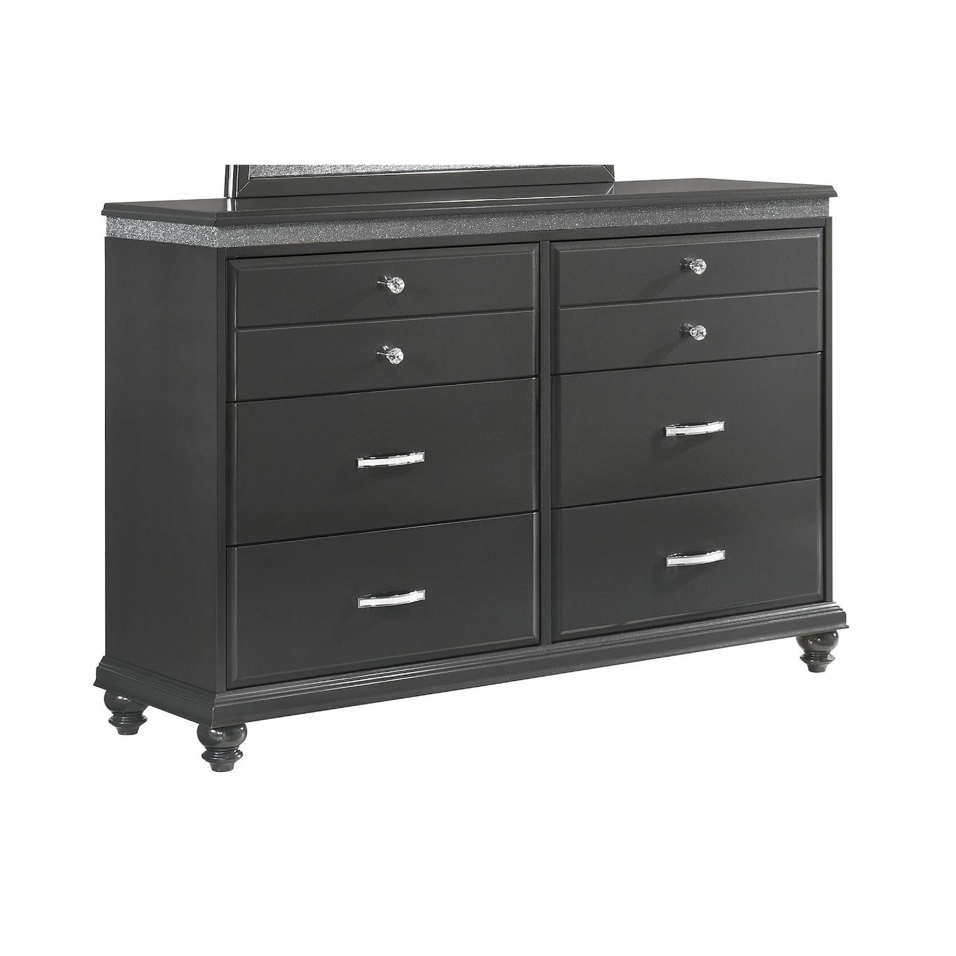 If you are looking to bring a touch of glam into your space this dresser is sure to impress. A clean silhouette sits on bun feet for a timeless look. Featuring elegantly glamorous drawer and knob pulls, as well as a glittery outline around the top, this piece is unlike any other.