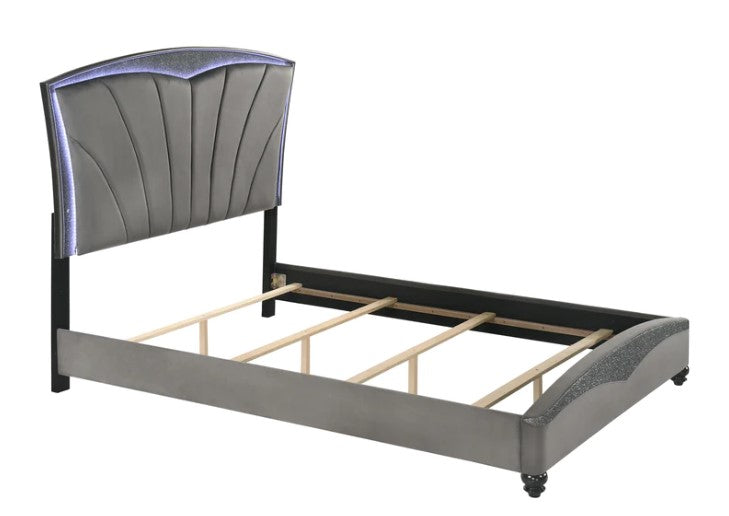 Spice up the look of your bedroom with the addition of this platform bed. The upholstered headboard is outlined with a glamorous sparkly design that pairs nicely with the traditional bun feet, giving you a bed like no other.