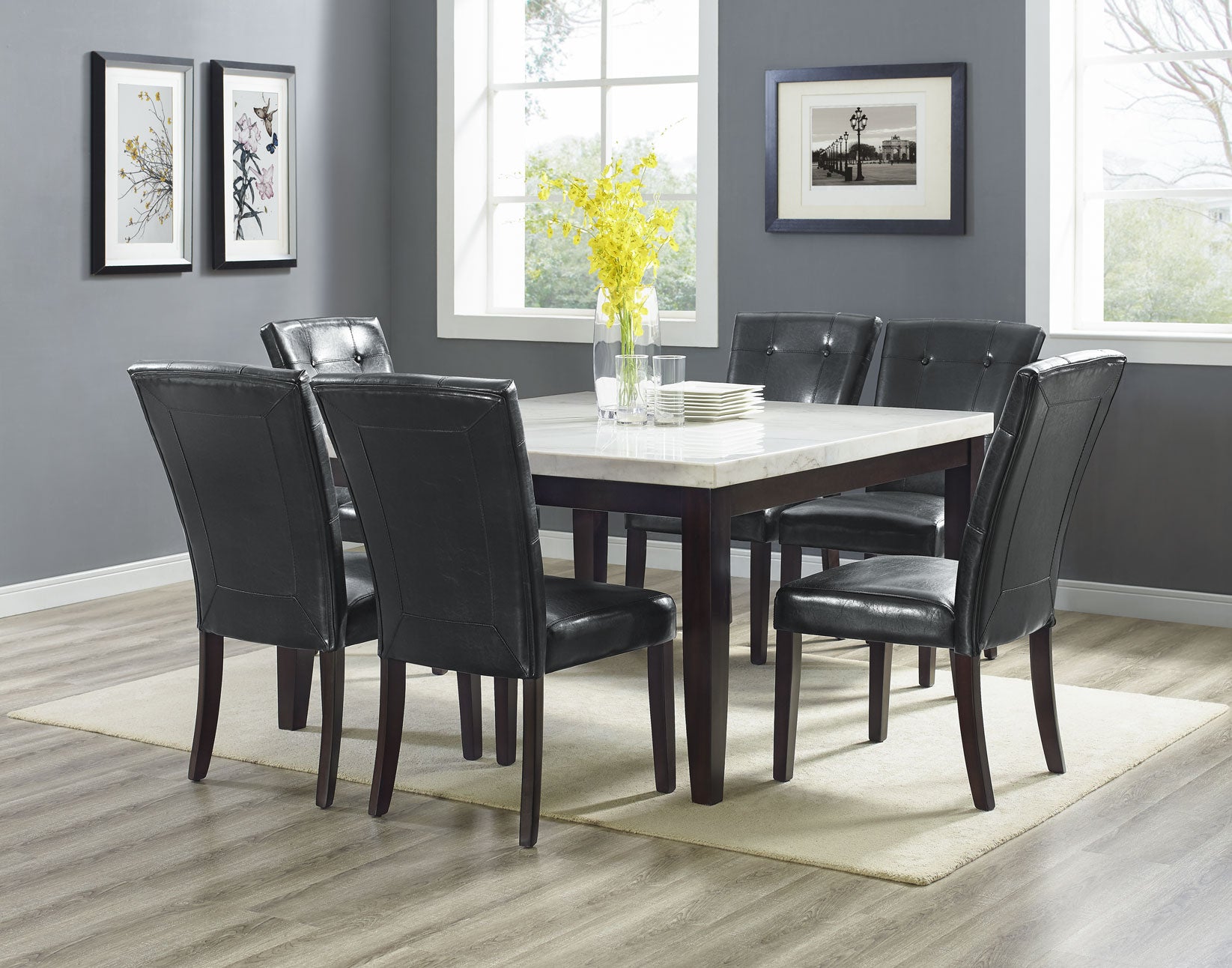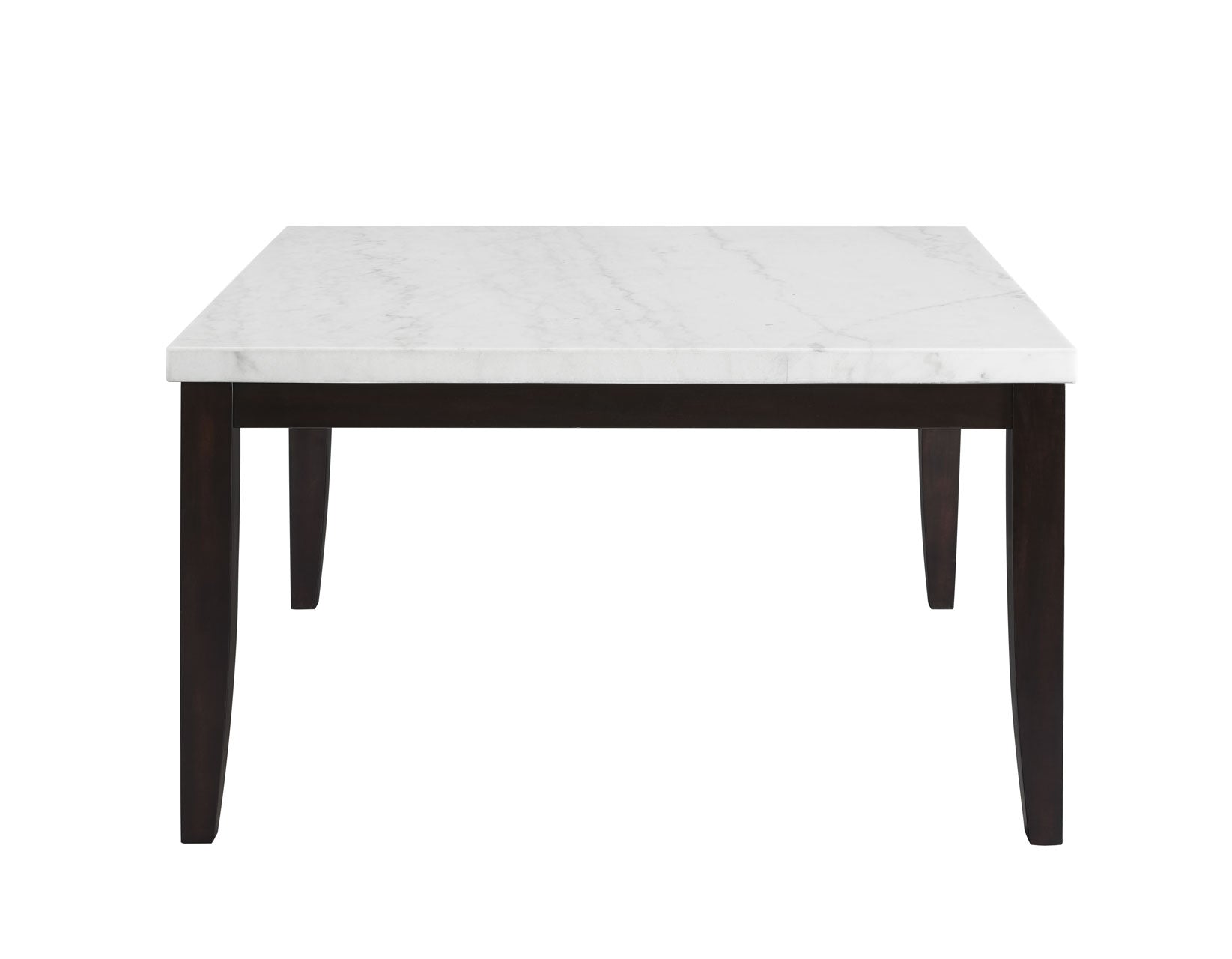 Elegant stone top dining with Francis by Steve Silver Furniture. The 54-inch square table allows for seating of eight with a shape that facilitates conversation around the table. A rich cordovan cherry finish pairs beautifully with a white marble top for dining at its finest. Shown in dining height, Francis can also be configured in counter height. Pair with the lovely tufted back, easy-care polyurethane chair.