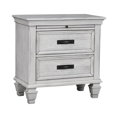 Go all-in on a country chic motif with this stunning two-drawer nightstand. Complete with a pull-out service tray, this nightstand is fully functional and includes cord access for charging electronics. The contemporary updates elevate the classic silhouette. In a soft antique white finish, the picture frame front drawers are full of rustic charm. The tapered legs feature intricate carvings that are full of sophistication.