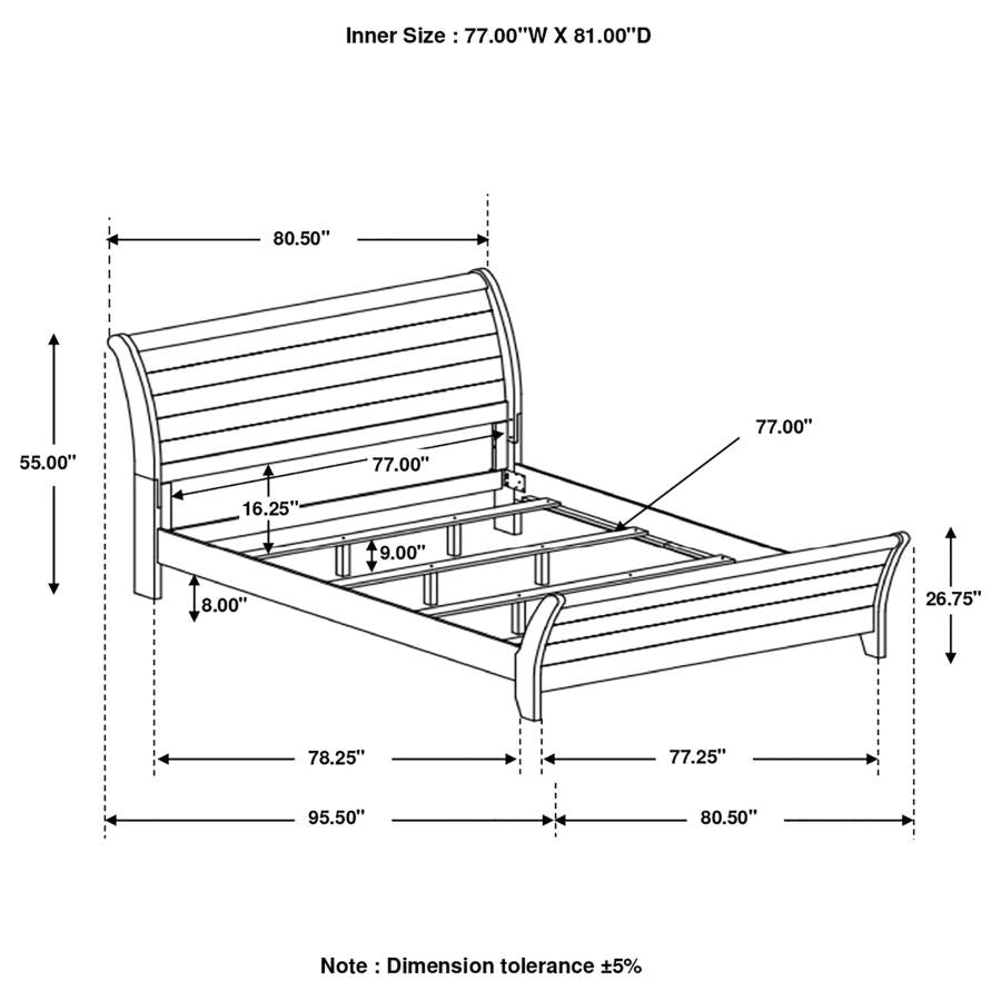 The bed sets the tone in any sleep space, and this rustic bed gives your bedroom a warm, cozy ambiance with an abundance of style. The curved sleigh style headboard and footboard both rise majestically and features a plank design. The exclusive Coaster design is finished with a rich weathered oak that boasts handsome wood grain details. The solid wood legs taper at the footboard for a subtle stylish touch. This sleigh bed is the perfect bed if you have your eye on creating a majestic oasis out of your bedroom.