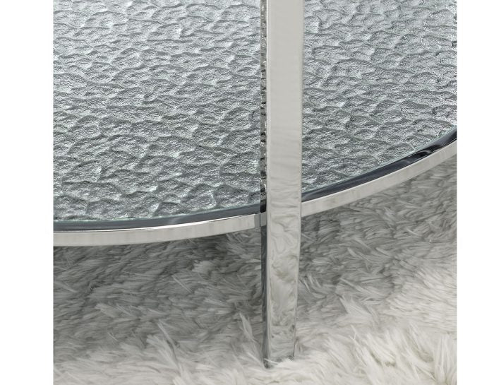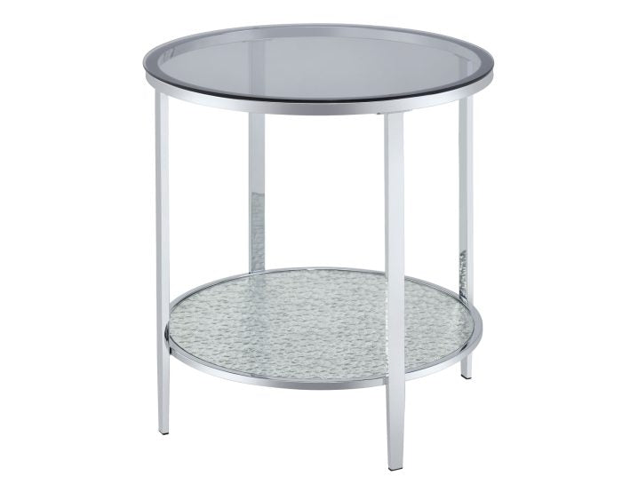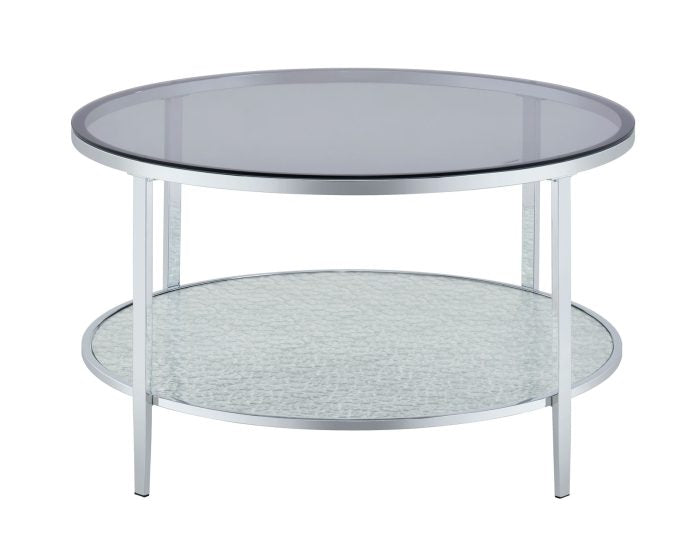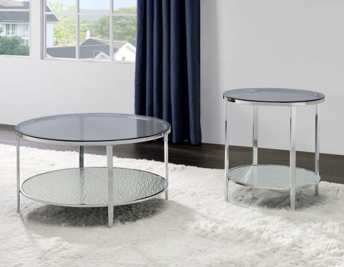 Smoky glass tops, a patterned mirror shelf and a chrome base combine to add sparkle and glam to a room in this romantic set of Living Room tables. Frostine features a round shape that softens a room and makes it easier to navigate by eliminating pesky corners. Use with a Sectional or Sofa and Loveseat sets to add a glamorous touch to your home base