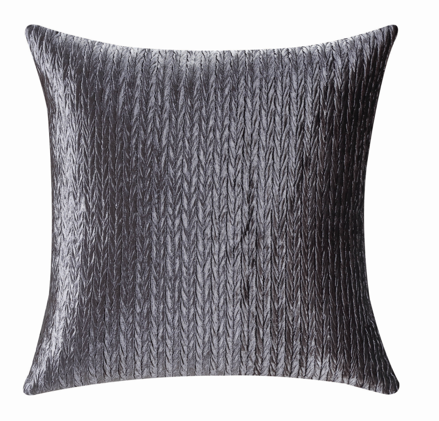 - Bench seating and textured accent pillows complement the silver velvet upholstery