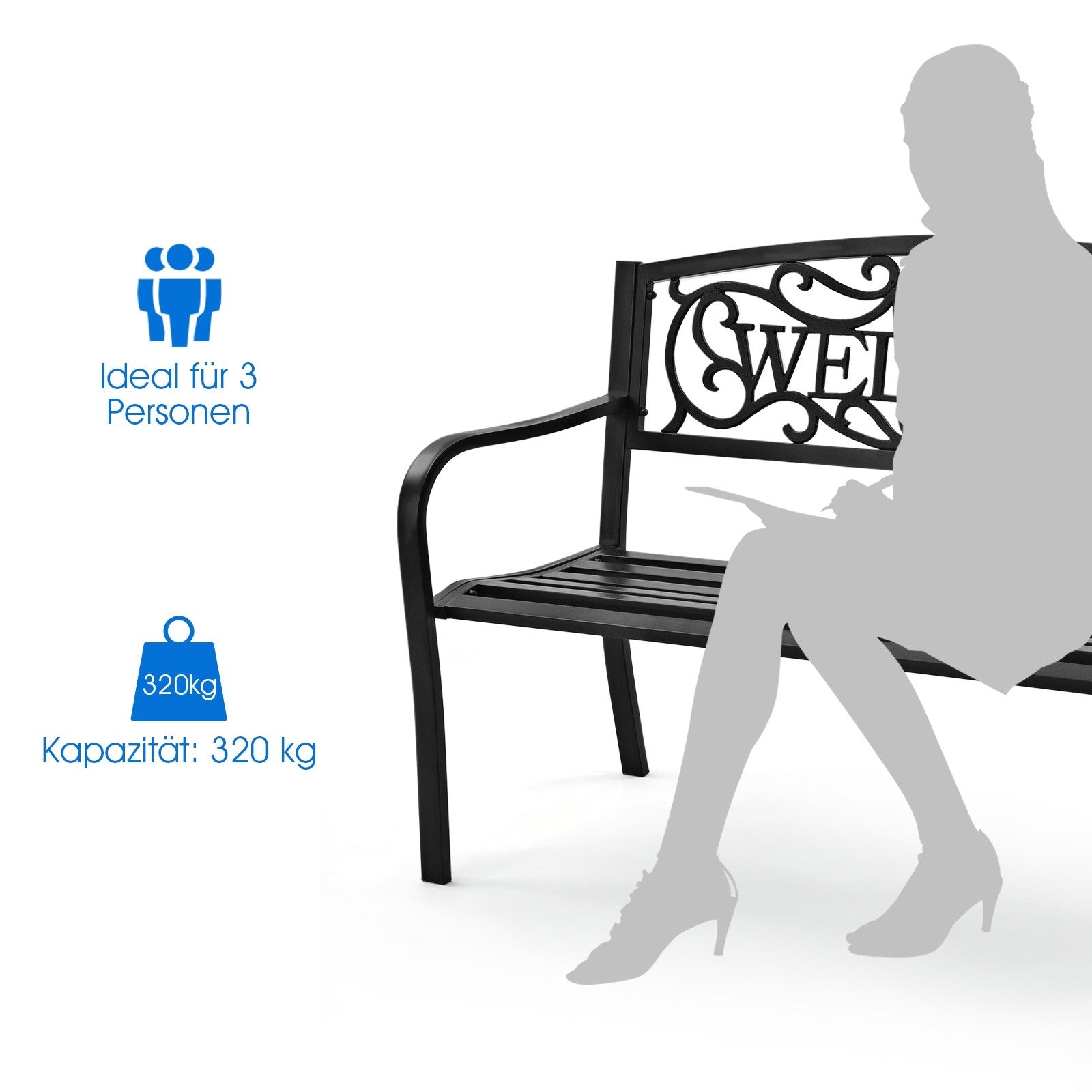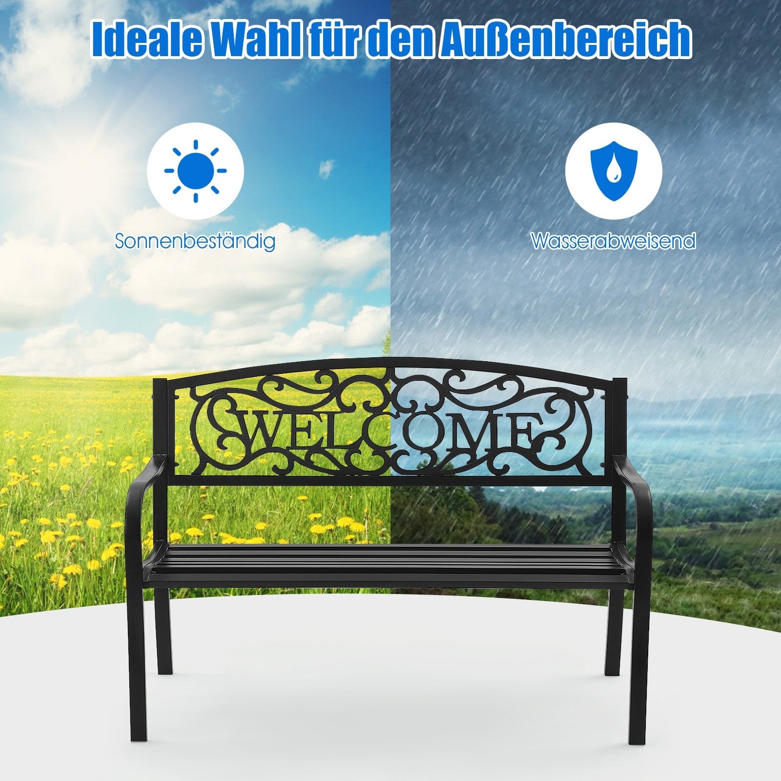 On seeing the "welcome" carved on the backrest, your family and friends will surely feel warm and relaxed. With an armrest and seat board fits your body line, you and your family can sit on the beautiful bench comfortably, enjoying the peace and natural beauty. Crafted with durable metal frame and fine coating, this park bench is able to withstand all weathers for your long-time use.