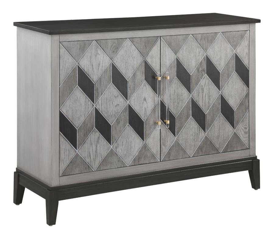 Keep your room essentials close at hand in this space-saving modern glam accent cabinet. A long rectangular frame presents a striking chevron motif in a brushed black and grey finish for a bold, dramatic expression to your space. Two large cabinet doors open to reveal two adjustable shelves for sorting and storing items. Adorning each cabinet door is a slender, clear, acrylic pull handle fastened to a warm metallic mount that lends a glam touch. A bold, black top and base with angled legs create a striking contrast that showcases the decor above and the rugs underneath.