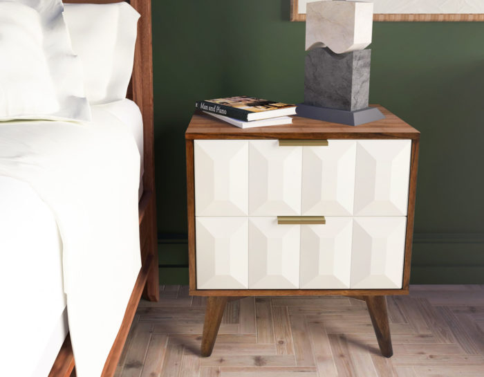The best of mid-century modern design comes out in the Ginny Nightstand. White pyramid fronts contrast beautifully with the burnished walnut wood color for a Nightstand you will absolutely love. But not only is this the coolest looking Console Table you can find, but it is also built for service with canted cylindrical legs, English Dovetail drawers and whisper-quiet smooth metal side glides.