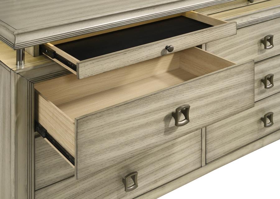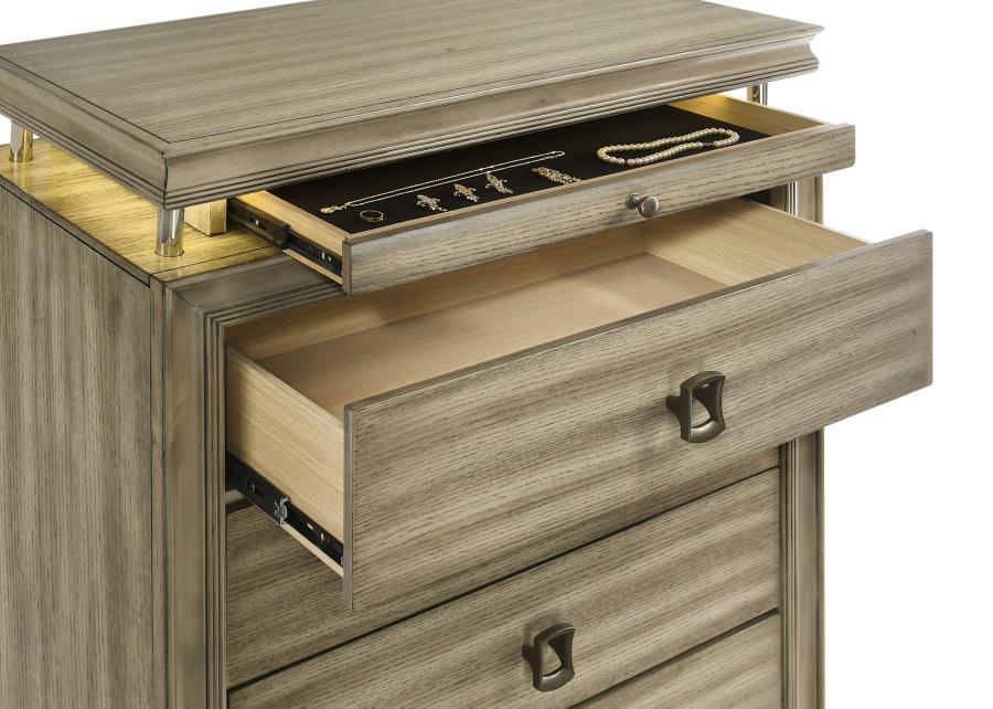Design the bedroom of your dreams with a five-piece modern bedroom set that centers on a stylish bed complete with an upholstered headboard. Its gorgeous neutral rustic beige wood grain finish pairs perfectly with beige fabric on the channel tufted headboard, while the dresser, chest, and nightstand add ample storage and include both felt-lined top drawers and built-in LED lighting. Main drawers features bold hardware while petite top drawers add knobs, offering the perfect touch of dimensionality and contrast. LED lights have a warm yellow hue and are operated with touch buttons for simple, easy operation as you lounge and relax in the evening. The bed is a modern silhouette, complete with a floating look for its headboard and a low footboard that ensures an airy, open silhouette. |