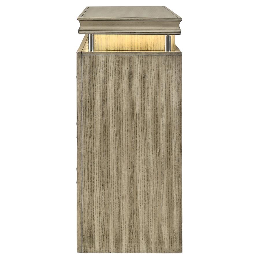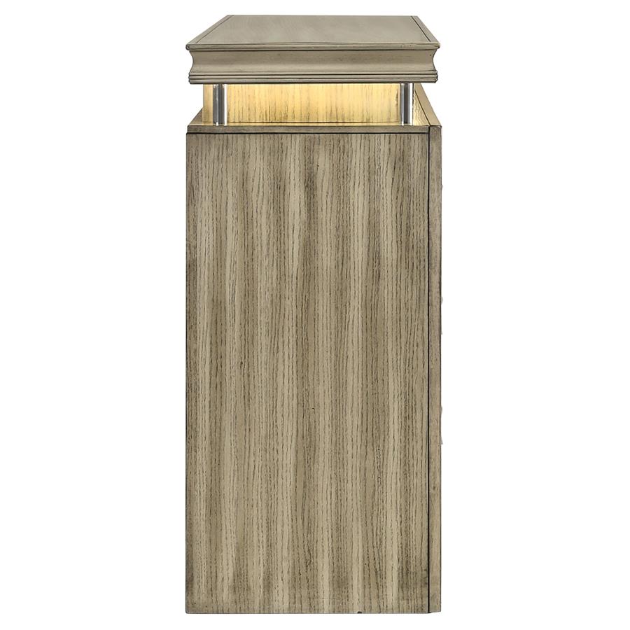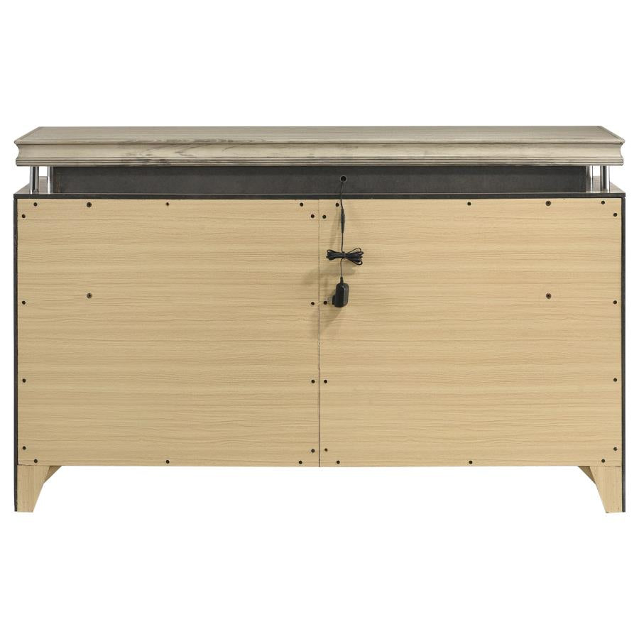 You're going to love the mix of stylish detail and abundant storage featured in a modern eight-drawer dresser. It features a distinctive look with a raised top that offers two recessed, felt-lined drawers perfect for jewelry and accessories, and a built-in LED light. The light creates inviting ambiance with a warm yellow hue and a touch switch for easy operation. The dresser boasts a soft, neutral rustic beige wood grain finish, perfect for a variety of bedrooms and surrounding decor motifs. Six large drawers create the base of the dresser, providing plenty of space to organize clothing, linens, and more.