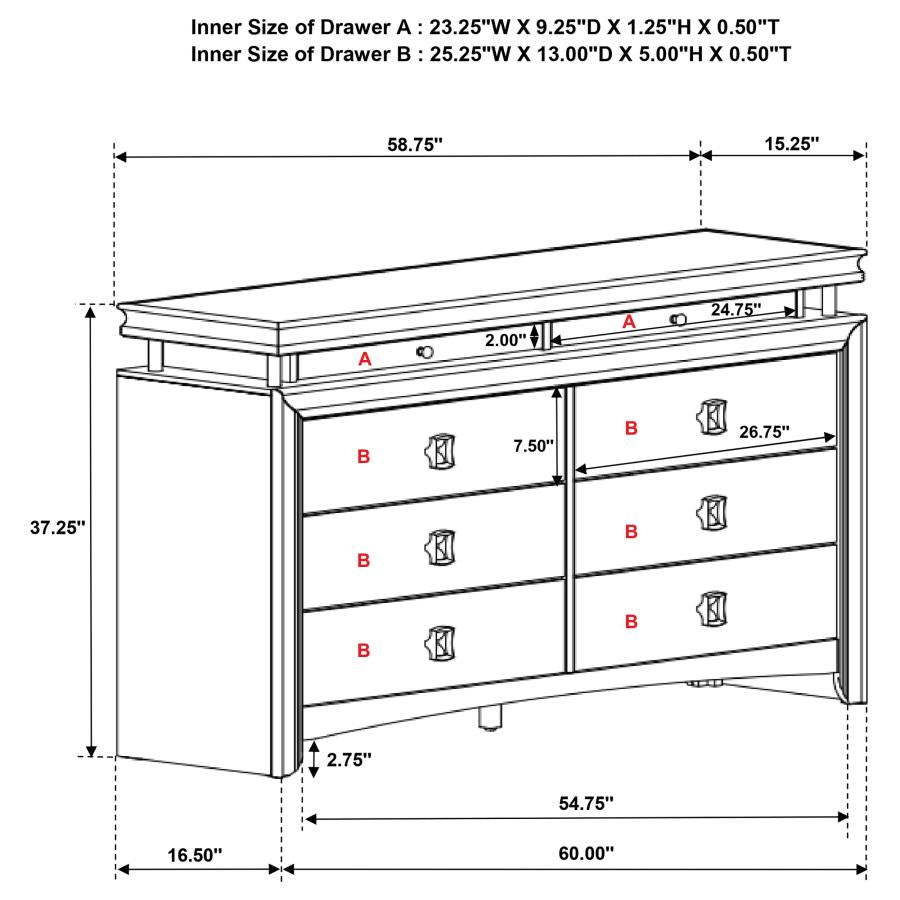 - Distinctive open rectangular hardware complements six larger drawer fronts