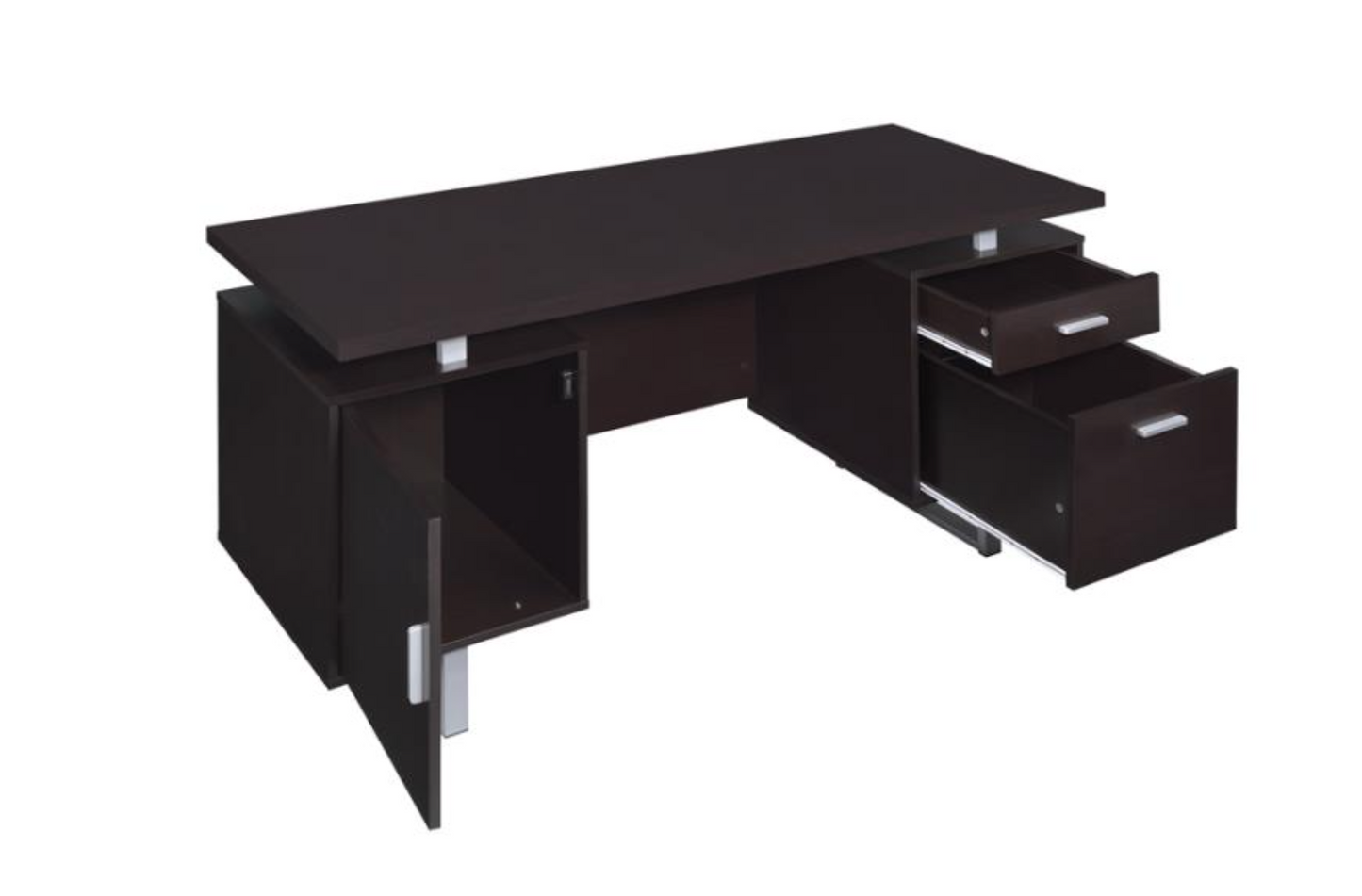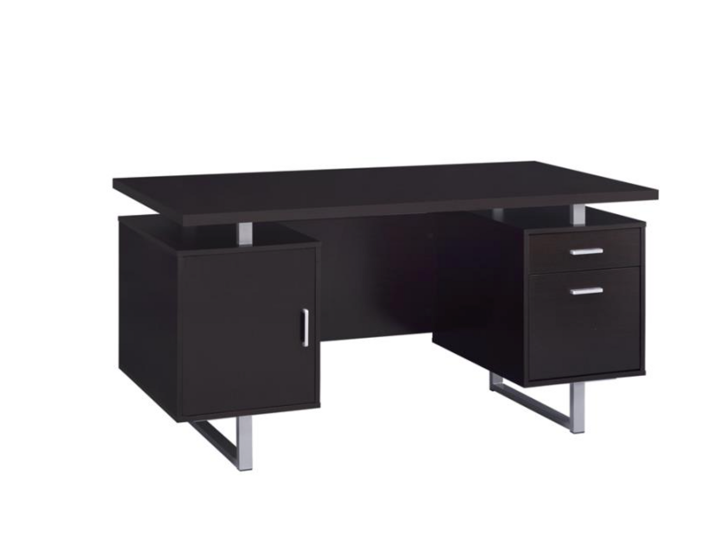 Enjoy an intriguing architectural design in this office desk. A floating top creates a visually enticing effect and a completely different look. Finished in deep cappuccino, it flatters surrounding decor and delivers a dramatic touch. Store essentials in a cabinet and drawer, and use a file cabinet to organize papers. Contrasting silver hardware and steel legs plays up the contemporary flavor of this stylish desk.Set includes: One (1) office desk