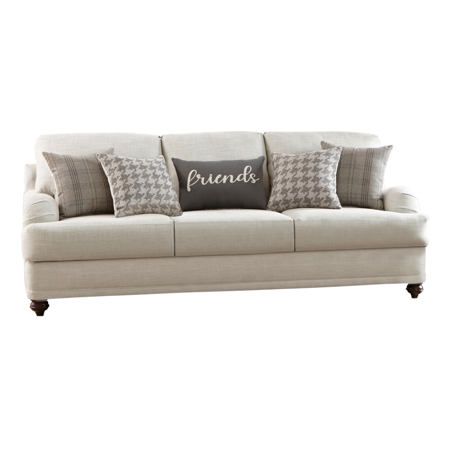 Add a delightful presence to your living room or den and make it an inviting place for friends and family. This two-tone modern farmhouse sofa helps confirm that friends are always welcome. It features light grey linen-like seat cushions that are reversible, helping extend the life of your upholstery, along with contoured armrests. The sofa also features exquisite bun legs in a rich contrasting espresso finish. To tie the entire design together, accent pillows with complementary tones and patterns are included.