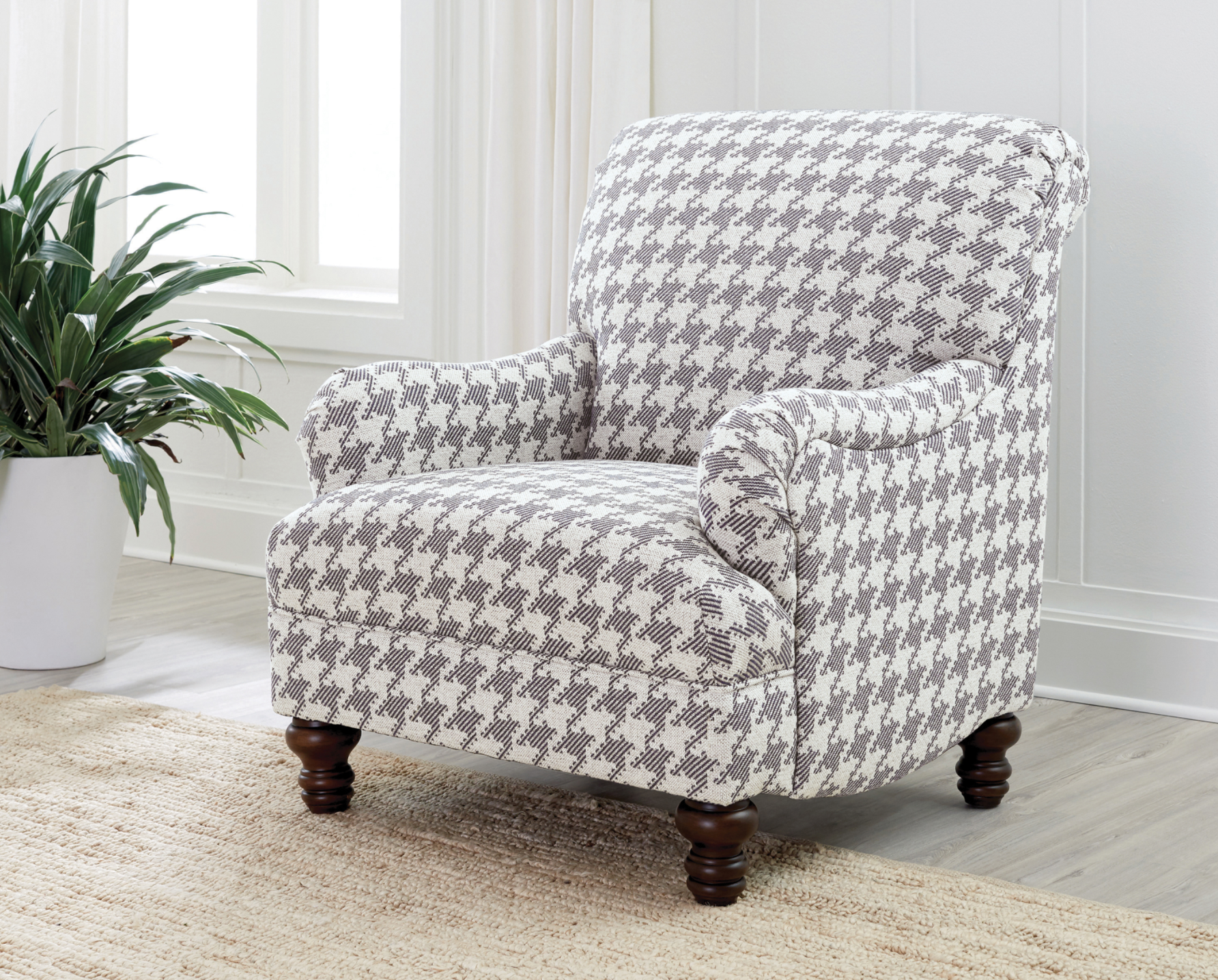 Create a beautifully styled living room that exudes classic character. This modern farmhouse accent chair makes any living space feel a bit more inviting. A rolled back and tailored English arms add a dash of character to its classic silhouette. A plush, padded seat creates a comfortable space to enjoy hours of casual lounging. This grey chair boasts a charming houndstooth pattern all over for a charming accent to any room.
