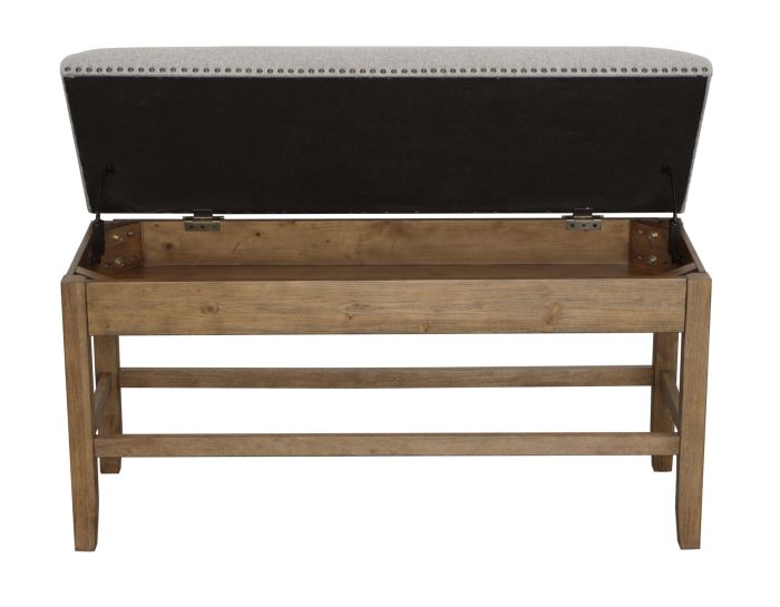 - Lift-top concealed storage offers a convenient and discreet space to store your belongings while nailhead trim adds a subtle design accent to the bench