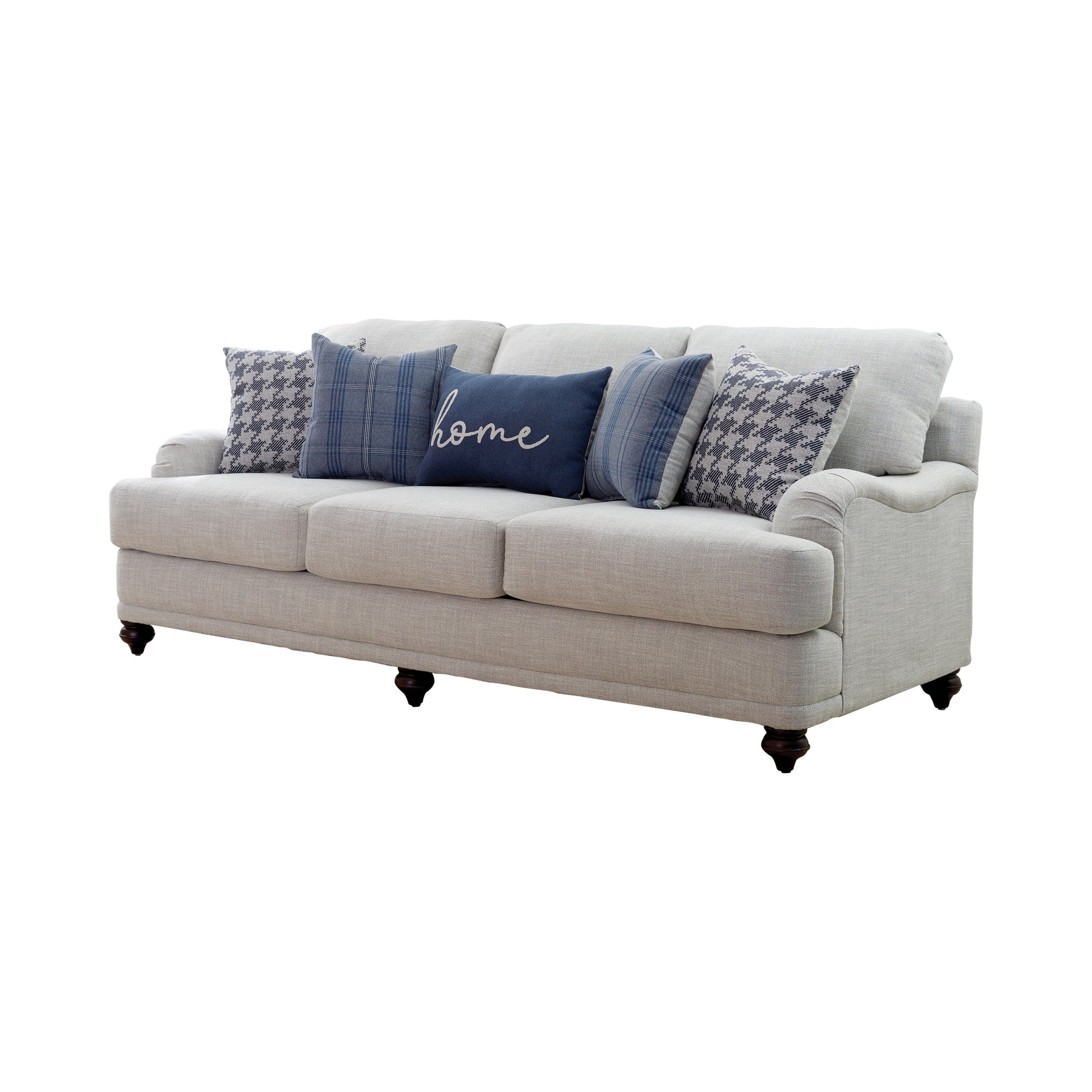 Taking a page from cottage-style farmhouse ambiance, this two-piece sofa and loveseat set wins over family and guests with its elegant simplicity. With tailored English arms and turned legs offering a contrasting espresso finish, each piece of this set shines with a pale grey linen-like upholstered cover. Reversible cushions with T-cushions on each end create comfort and stay in shape, as a solid wood frame with a sinuous spring deck sets the stage for durability. Attached back cushions remain stationary to prevent shifting. Enjoy the designer look of nine accent pillows with varying blue print covers.