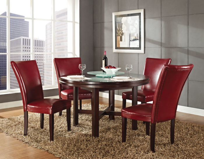 People love round dining tables and Hartford presents a wide range of choices for this shape table. The conversation will just seem to flow around the table with this and 52-inch table. The deep espresso finish and brown or red polyurethane chairs offer a great choice for any transitional dining area and the lazy susan makes serving a breeze.