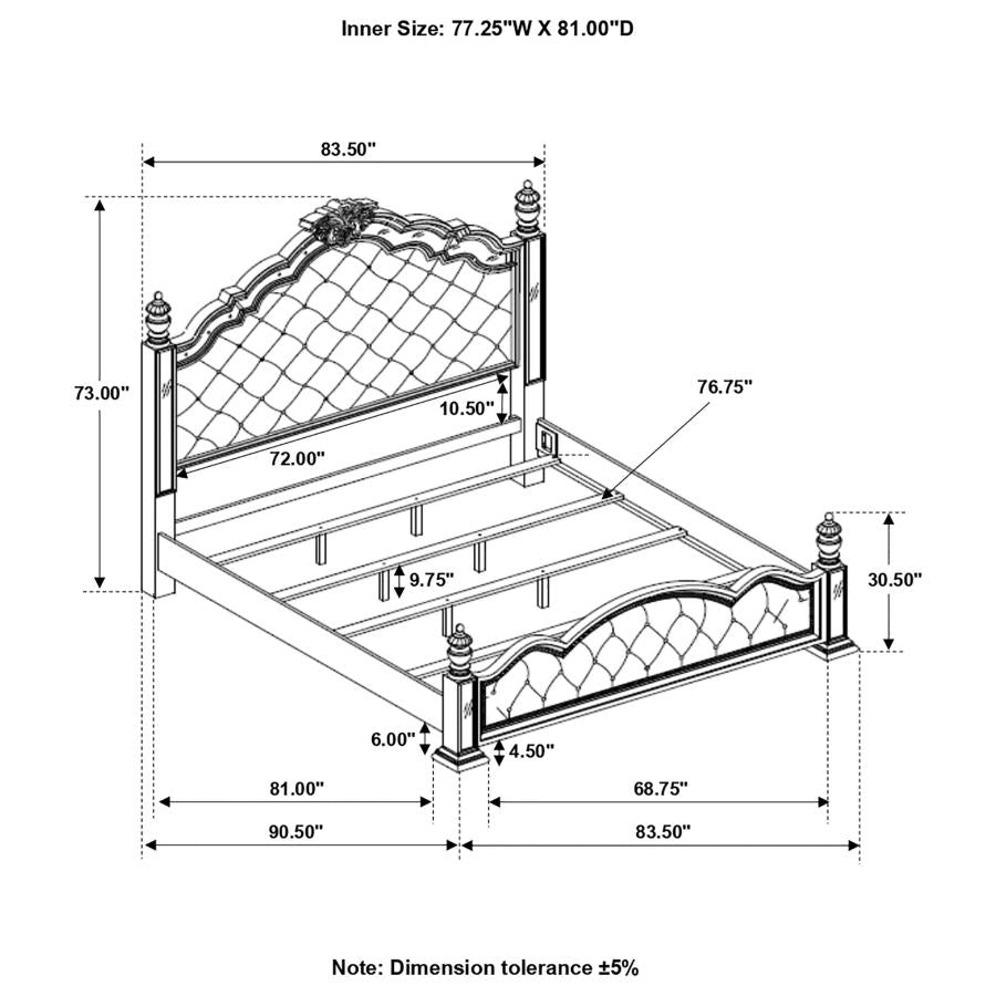 Invite a glamorous atmosphere into the master bedroom with this luxe bed from the Heidi collection. A metallic platinum finish highlights the Hollywood glam feel, accented by mirrored panels framing the headboard and footboard. The exquisite bombe style headboard and footboard feature intricately carved wood details along the edge, with turned finials for added visual interest. Plushily upholstered headboard and footboard showcase a rich black velvet with tufting detail. This luxe bombe bed makes the perfect centerpiece for a queenly bedroom.
