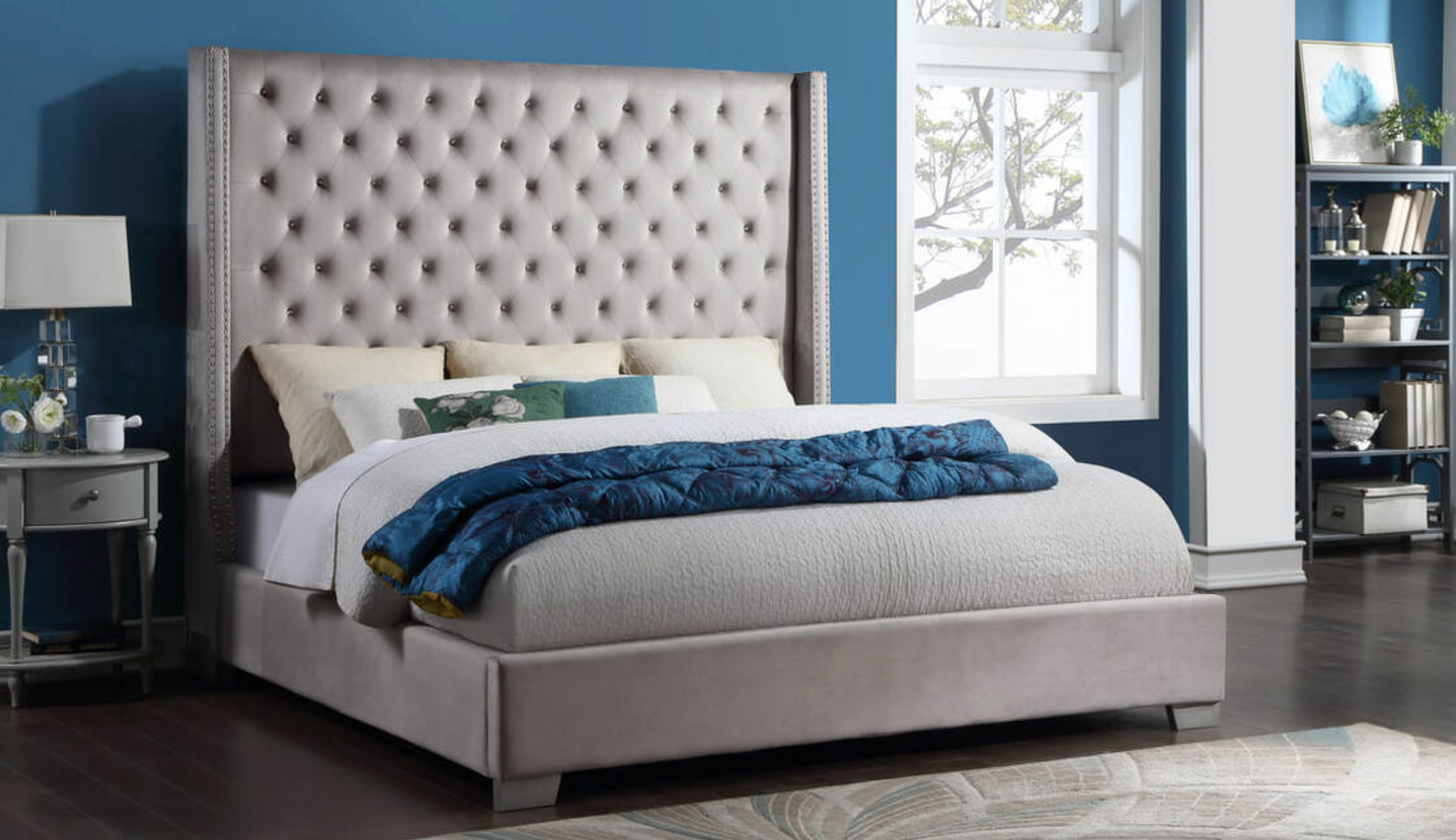 Description: 6FT Tall upholstered headboard covered in Grey Faux Leather with Diamonds or Velvet 6Ft Tall Upholstered Tufted Headboard