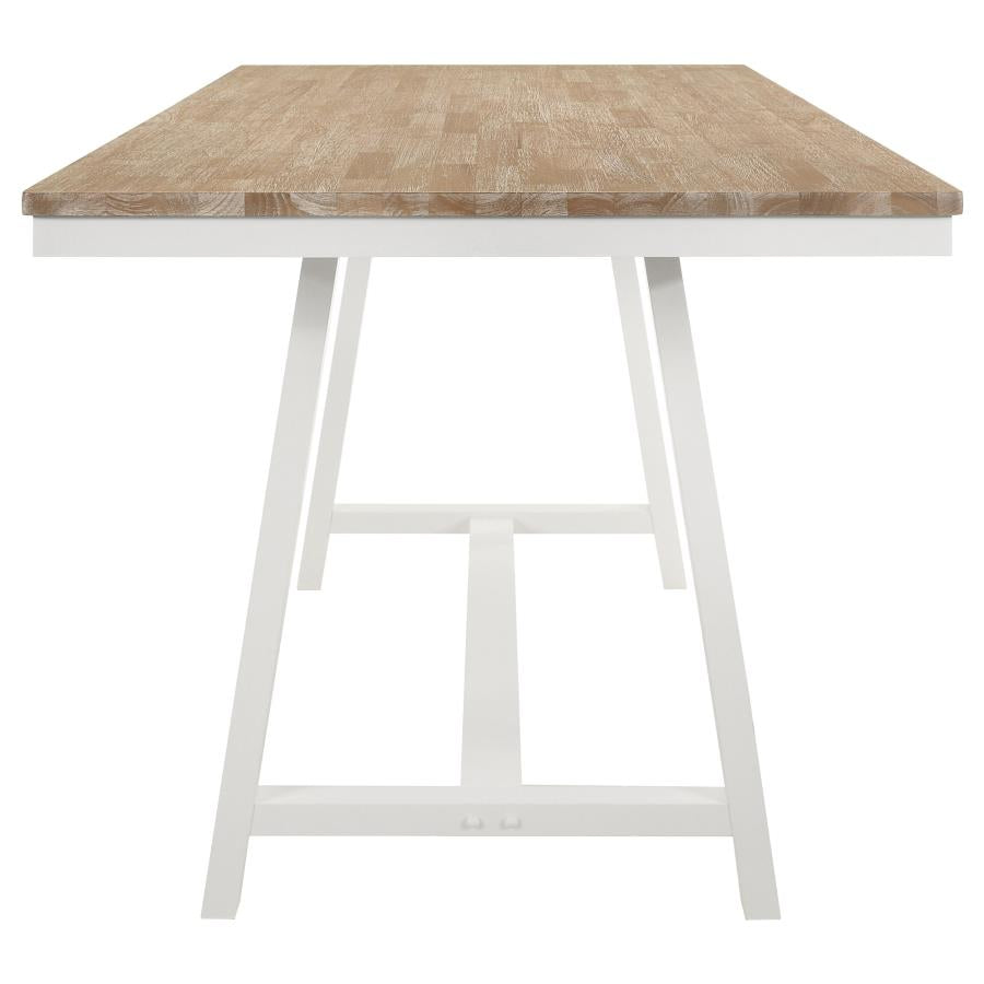* Modern farmhouse counter height dining set is perfect for a kitchen or breakfast nook * Two-tone table design features a crisp white base and a wire brushed brown wood tabletop * Angular trestle base adds character and visual interest while maintaining a streamlined look * Four chairs feature open X-cross backs with light gray padded upholstery on the seats * Counter height design is casual and inviting, perfect for a welcoming family space * Seamlessly accommodates and seats four to six individuals |