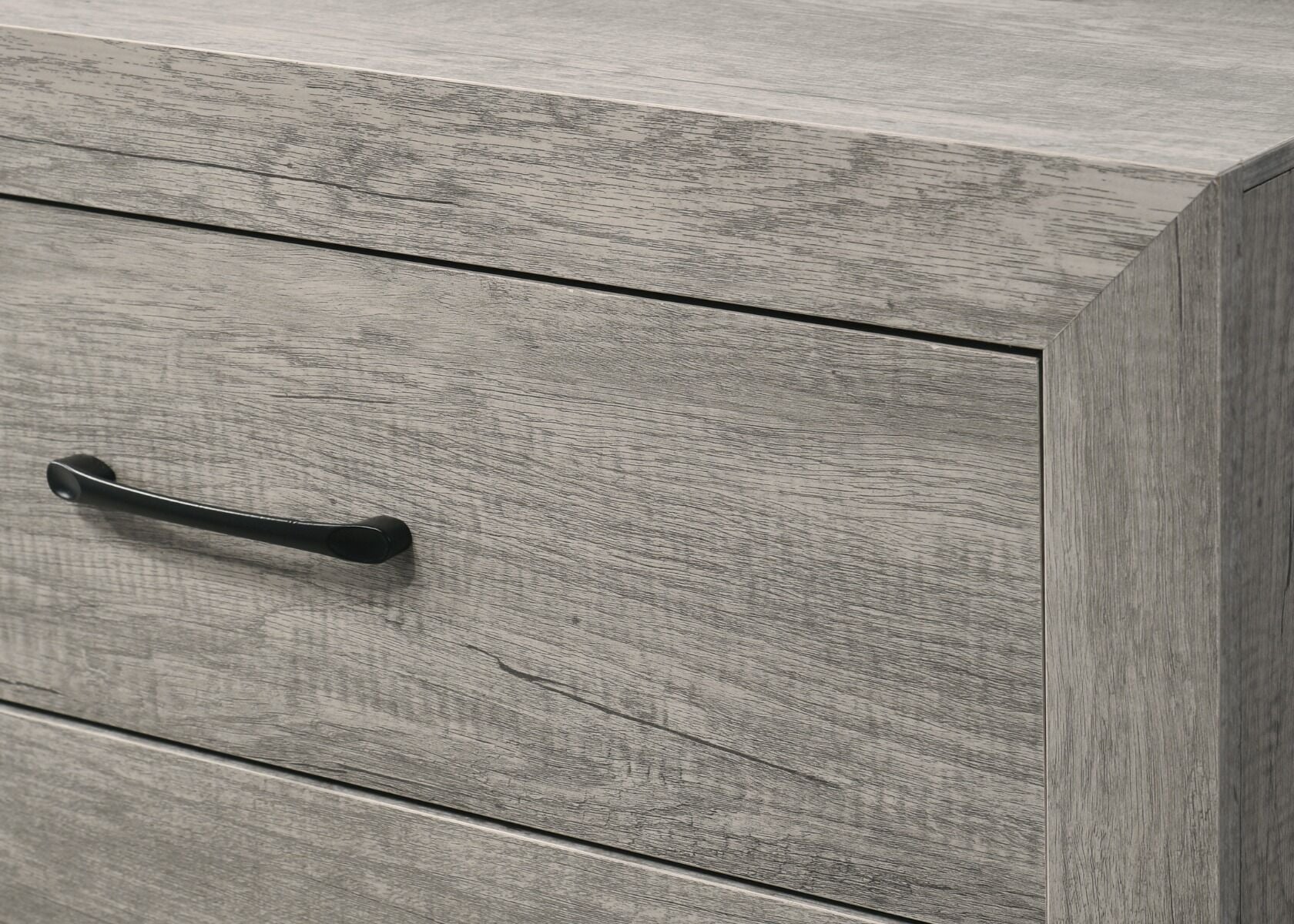 The Hopkins Platform Bedroom Collection in Driftwood offers a transitional style and is crafted with wood veneers and solids. This chic collection features durable construction, a bed in one box, and a simple and clean design. It also comes with metal pull handles for added convenience. Mattress required, sold separately. A great addition to your master suite or guest bedroom, this collection is perfect for updating your home decor.