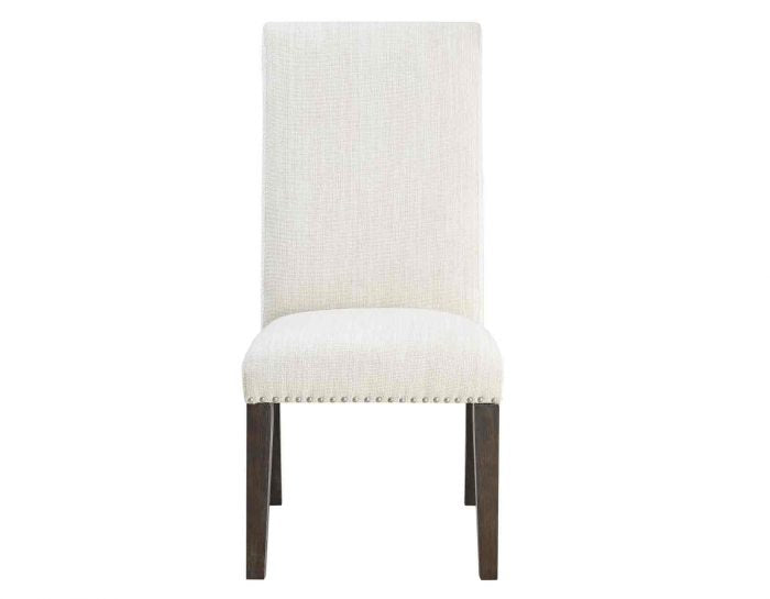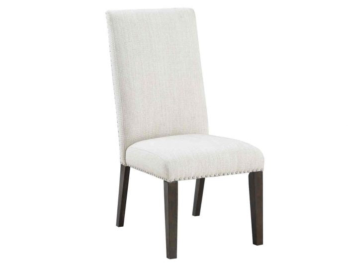 Classic styling with a modern twist, the Hutchins Upholstered Side Chair offers an elegant option for dining, desk or guest chair. Clean lines, brushed nickel nailhead trim and upholstered seat and back give the chair style and comfort while the dusty espresso finish offers an interesting contrast to the cream linen fabric. The chair can be used to dress up the Hutchins dining set or as a standalone chair in an office or living area.