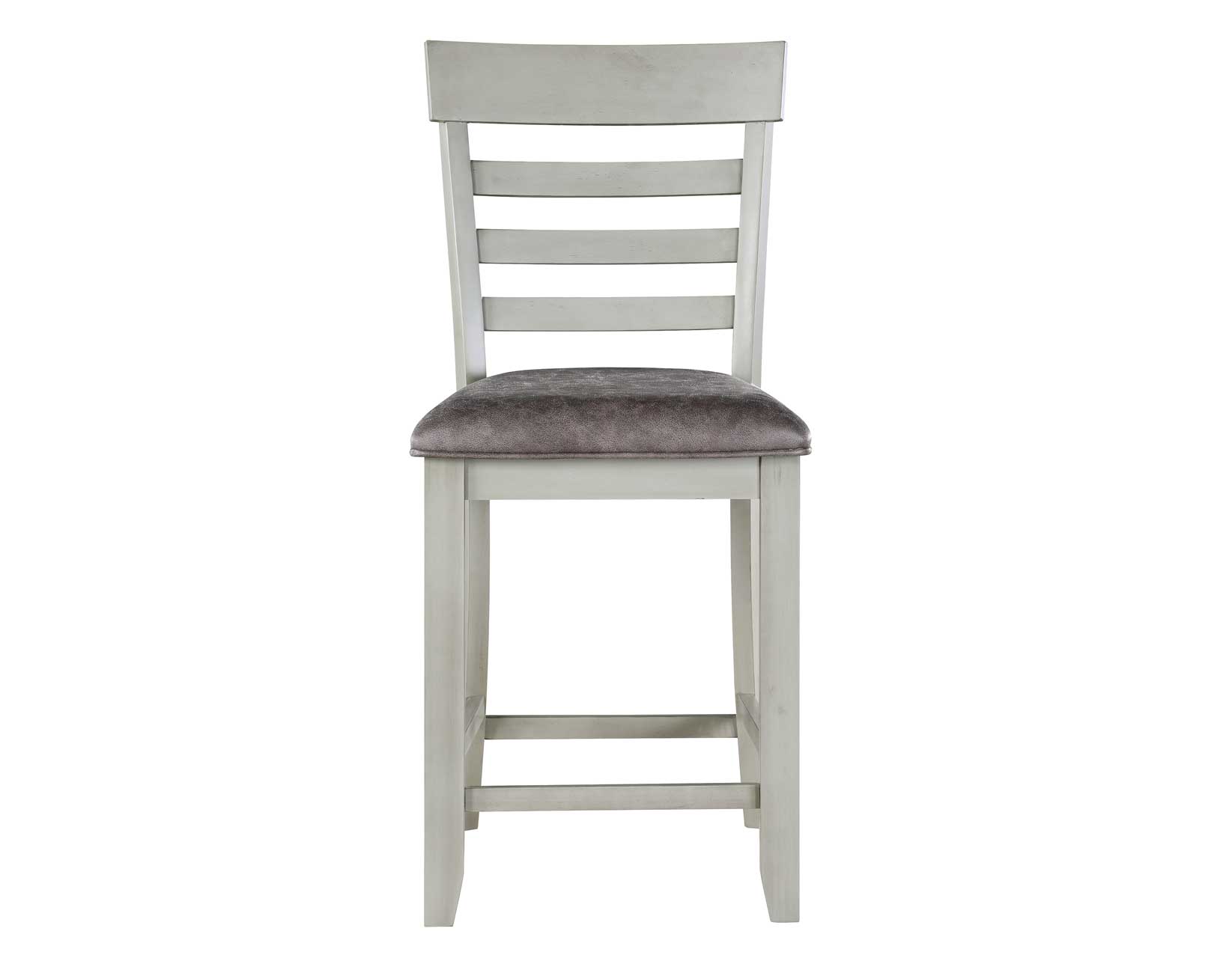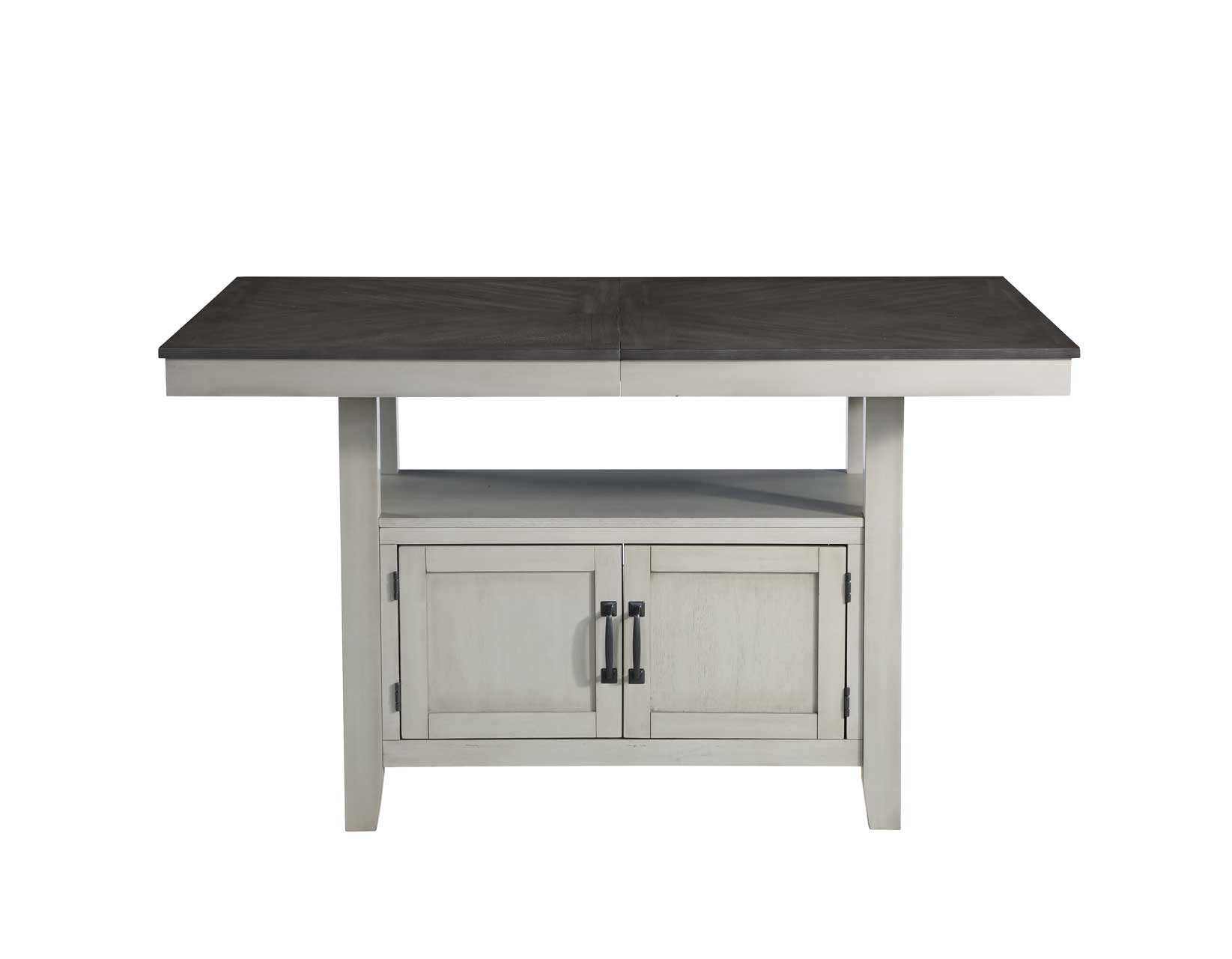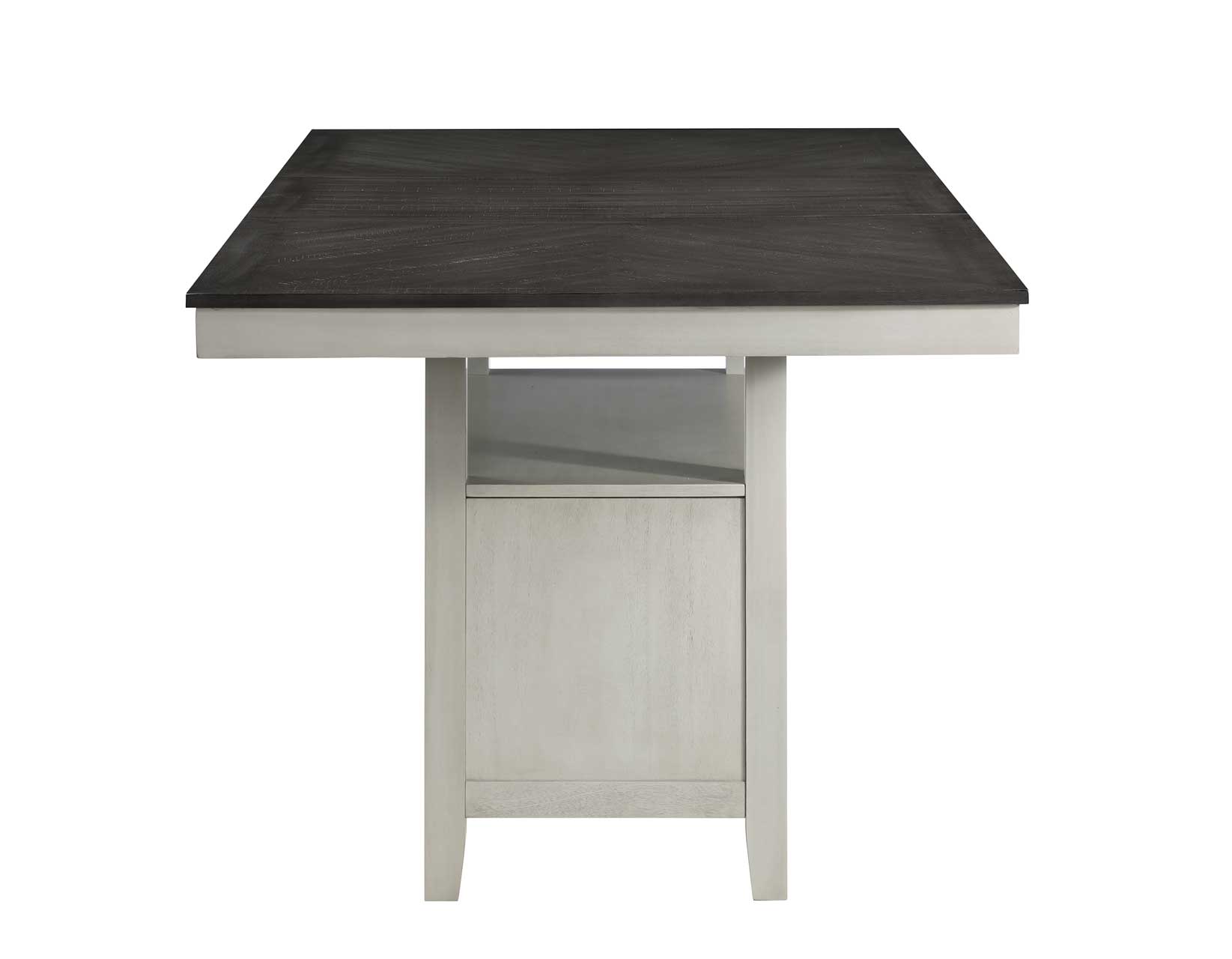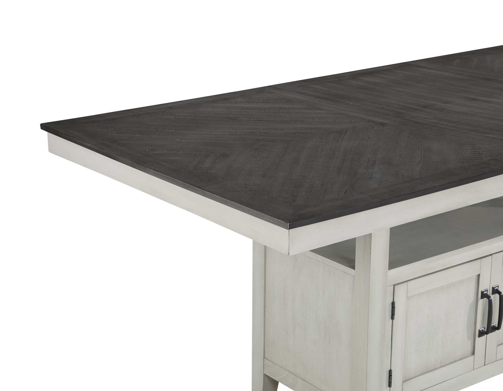 Relaxed, transitional styling in a neutral two-tone gray finish are the hallmarks of the comfortable Hyland Counter Dining Set. A Storage Counter Table anchors any dining area ably with a 20-inch insertable leaf to expand to 80-inches for seating of up to eight. The Stone Gray and Charcoal finish marries up with the oil-rubbed nickel hardware and vegan rawhide upholstered chair to create a fresh yet approachable dining set you will treasure for years.