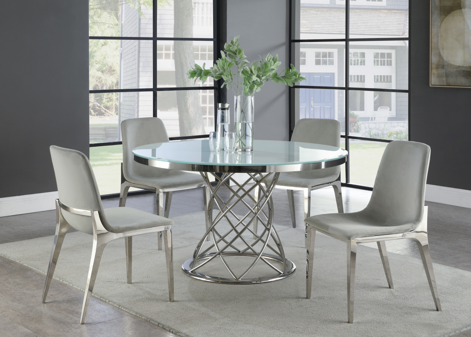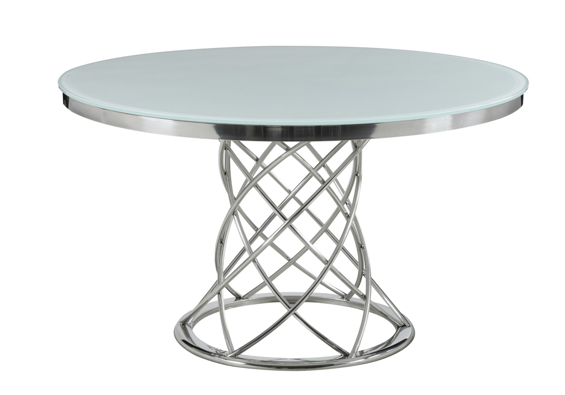 With an ultra-modern flair and unique design, this dining table is perfect for a more contemporary dining room. Elegant and sophisticated, the helix-inspired base is built of stainless steel that offers a durable, rust-resistant material. With a round tabletop surface, it offers plenty of room for up to six guests. Plus, the tabletop features a thick tempered glass in an opaque white frosted finish that brightens dishes and tableware. Available within the same Irene collection are matching dining chairs.