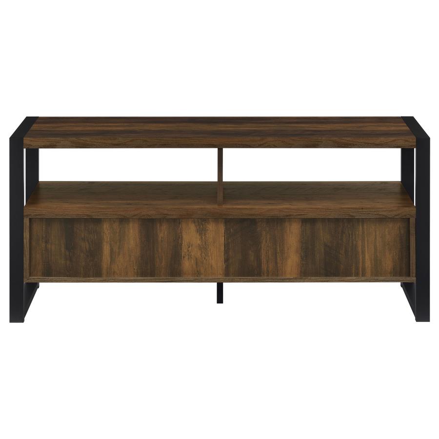 * Rich finish and linear design delivers modern industrial style to TV stand with storage space * Dark pine finish MDF creates sturdy build and alluring appearance in versatile, earthy TV stand * Stacked design features two open compartments to house electronic components, two lower drawers with Euro glides for easy operation * Black metal side braces and matching drawer pulls create streamlined design * Perfect for casual space that transforms into ideal place for sports or movies |