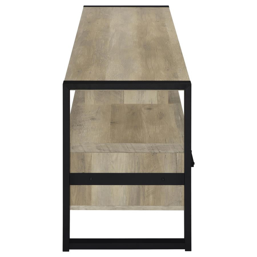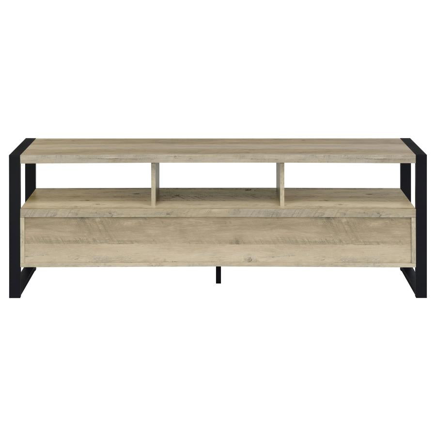 More than just a TV stand, this modern industrial unit serves multiple purposes and centralizes entertaining functions. With a cool antique pine finish, this stand is versatile and earthy. A stacked design is functional with three open compartments to house electronic components, and three lower drawers feature Euro glides for easy operation. Black iron side braces and matching drawer pulls create a slick contrasting finish effect. Choose this TV stand for a casual space that transforms into a perfect place for sports or movies.