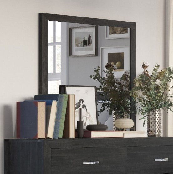 The Crown Mark Jaylen Dresser Mirror in Black is the perfect addition to your bedroom. With its transitional style, this mirror features clean, simple lines and a durable construction that is easy to clean. Attached to the dresser, this mirror is the perfect way to finish off your look. With a black finish and wood solid and veneer material, this Jaylen dresser mirror will be a stylish and timeless addition to your home.