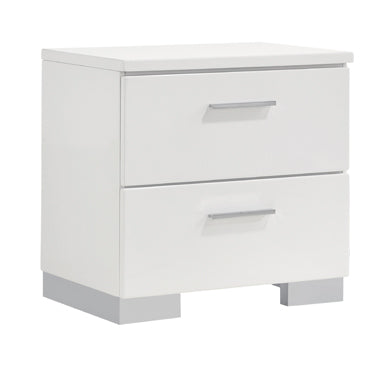 Bold and modern, this five-piece bedroom set is ideal for a contemporary home. It comes complete with a bed, nightstand, chest, dresser, and mirror to effortlessly complete your space. Each piece is coated in white polyurethane with a beautiful, high-gloss finish. Shining chrome accents add a dazzling hint of polish. With a sleek design and quality craftsmanship, this set is a stylish choice.