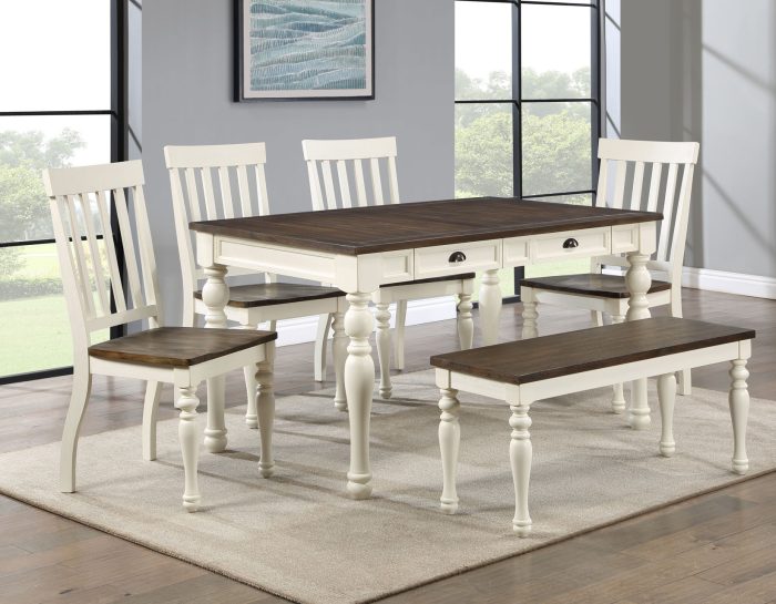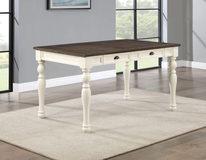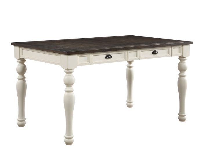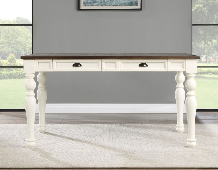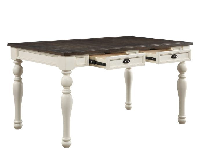 The Joanna Farmhouse Dining Table, measuring 59.5 inches, comfortably seats six, perfect for medium-sized dining rooms. This table, crafted with high-quality materials, showcases a rustic charm with its wire-brushed ivory and mocha finish. Elegant turned legs and four working felt-lined drawers for dining essentials add to its functionality and style. Its unique texture makes it a standout piece, blending style and functionality. Experience elegance and durability with the Joanna Table, a sophisticated choice for any home.