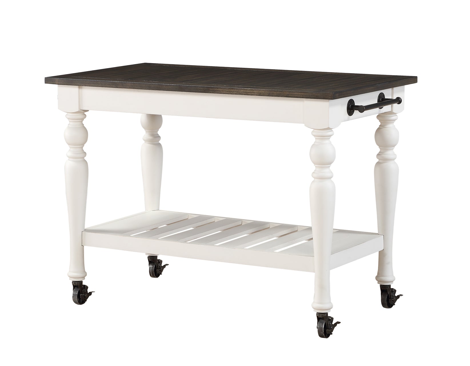 - Kitchen cart has hooks for hanging organization, bottom shelf for storage. A push bar and casters make for easy mobility.
