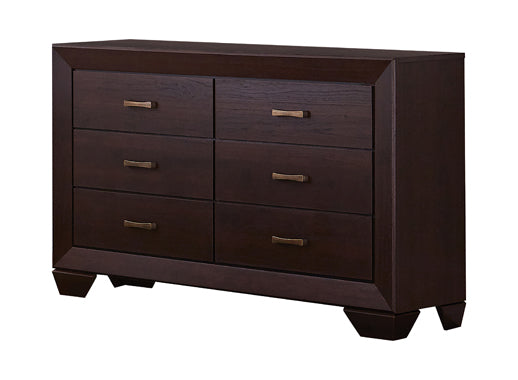 With clean, straight lines and an attractive design, this five-piece set enhances any bedroom with stunning, transitional glamour. With a bed, dresser, mirror, nightstand, and chest all included, it has everything you need to complete your personal sanctuary. Its deep, dark cocoa finish is accentuated by bold, black recessed grooves, giving it an elegant look. Its drawers are strong, sturdy, and spacious, offering plenty of convenient storage space to keep your belongings organized. Exclusive to Coaster, this sophisticated set is a fabulous addition to any home.