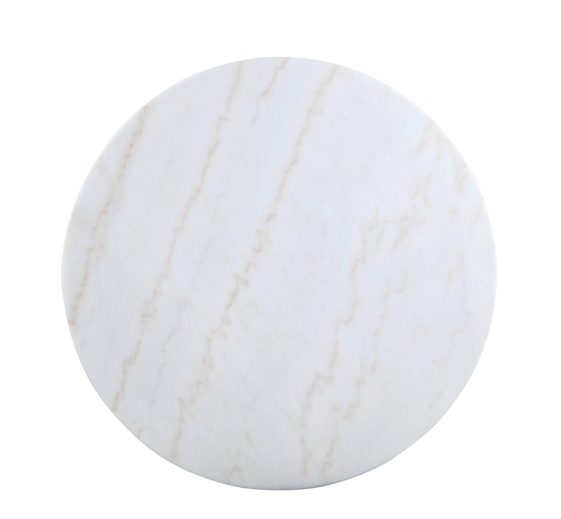 An elevated version of classic simplicity, this modern dining table features elegant details. Shiny and radiant, the subdued silhouette of the base gets a bold pop of color with a metallic brass finish. Dressing up the sleek top is a round white marble-like table top. Create a focal point in a contemporary dining room with an underlying chic motif. The balanced geometric shapes are full of crisp and clean personality.