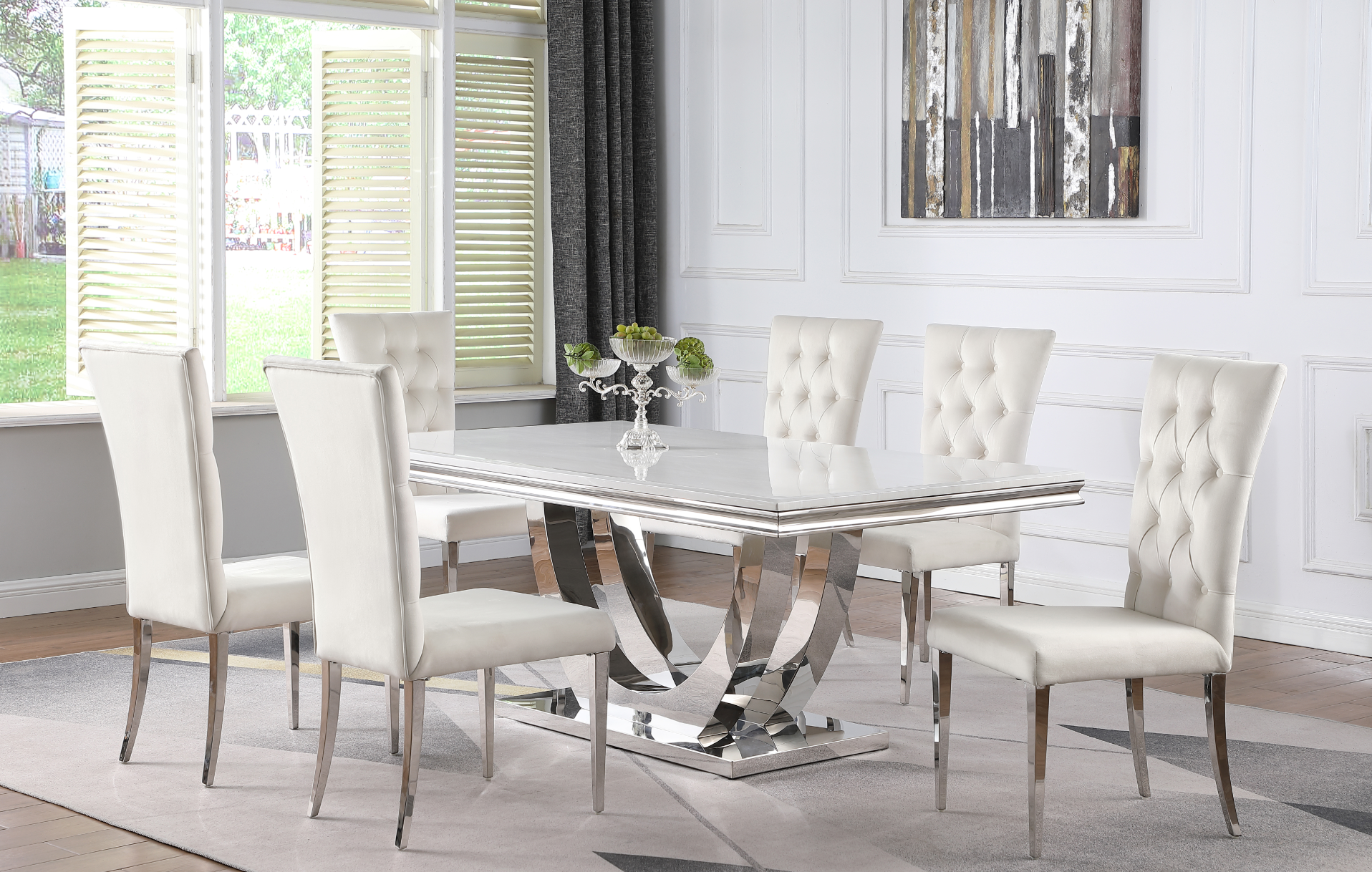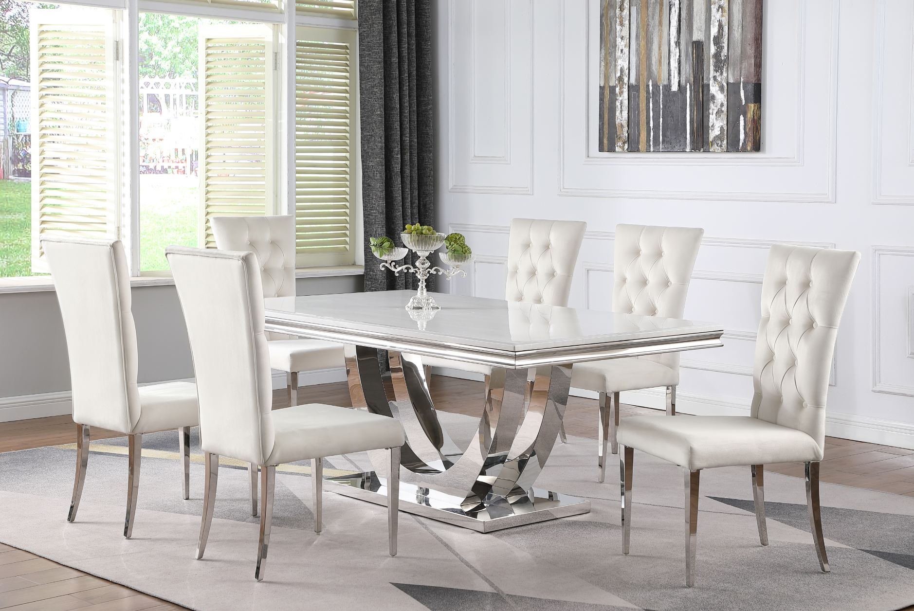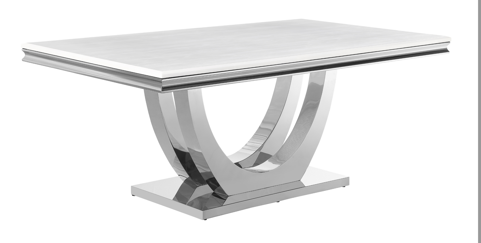 Host family and friends around this sleek, modern glam dining table for an elevated dining experience. Designed with an open demilune pedestal base in a lustrous polished chrome finish, this magnificent, rectangular dining table lends a luxurious look and feel to your space. A spacious tabletop is covered in a white marble paper and features a beveled edge that offers a timeless contemporary touch. The open pedestal base rests on a slim flush base that offers extra stability and a seamless expression. Seat six guests comfortably at this sophisticated dining table.