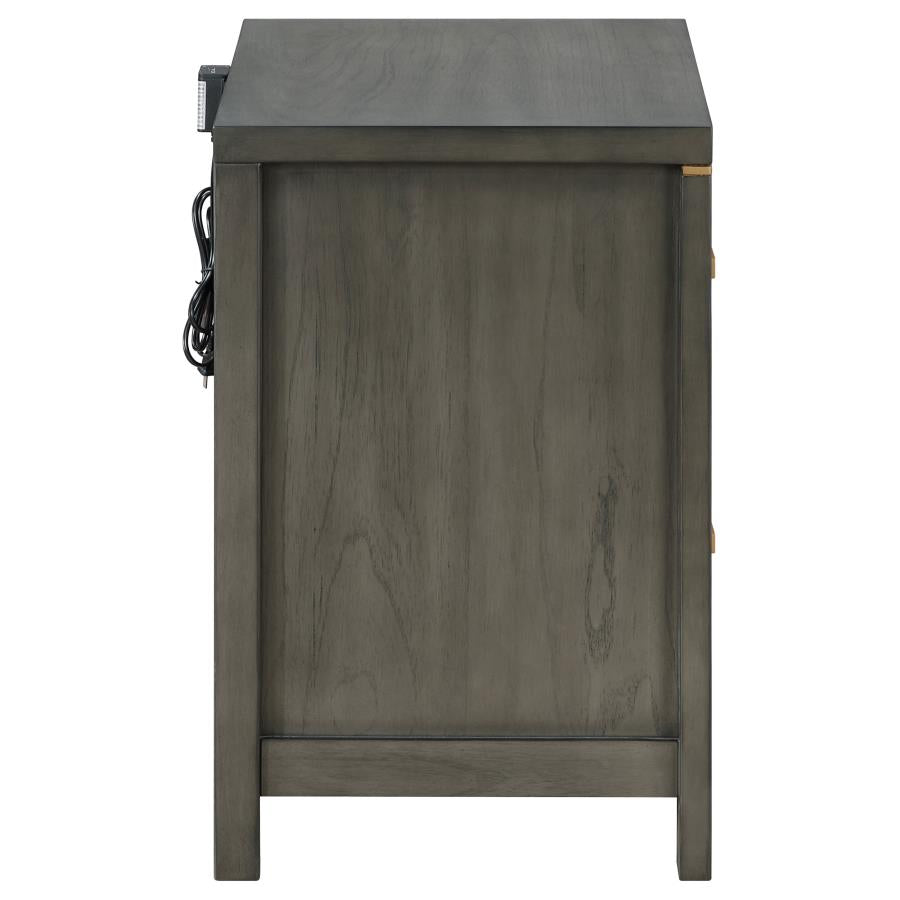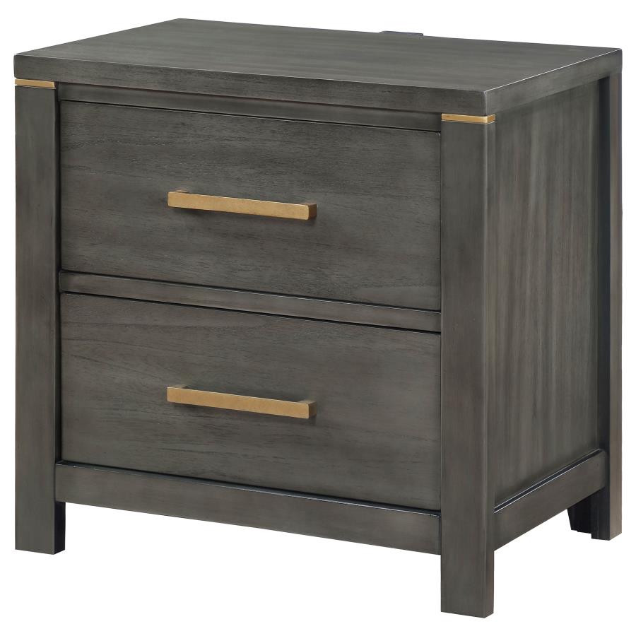 Complete a stylish, inviting bedroom with the refined look of a modern two-drawer nightstand. Its timeless stance showcases a soft gray wood grain finish, with brass toned accents and bar pulls that offer just the right touch of warmth. Its two drawers offer plenty of bedside storage for personal items and essentials, helping to keep your bedroom tidy and neat. The top drawer includes brown felt lining to protect delicate items or electronics, and a built-in USB port helps to keep your phone charged while lounging or overnight. Add a reading lamp to the top of the nightstand for a cozy, welcoming ambiance you'll love coming home to each night.