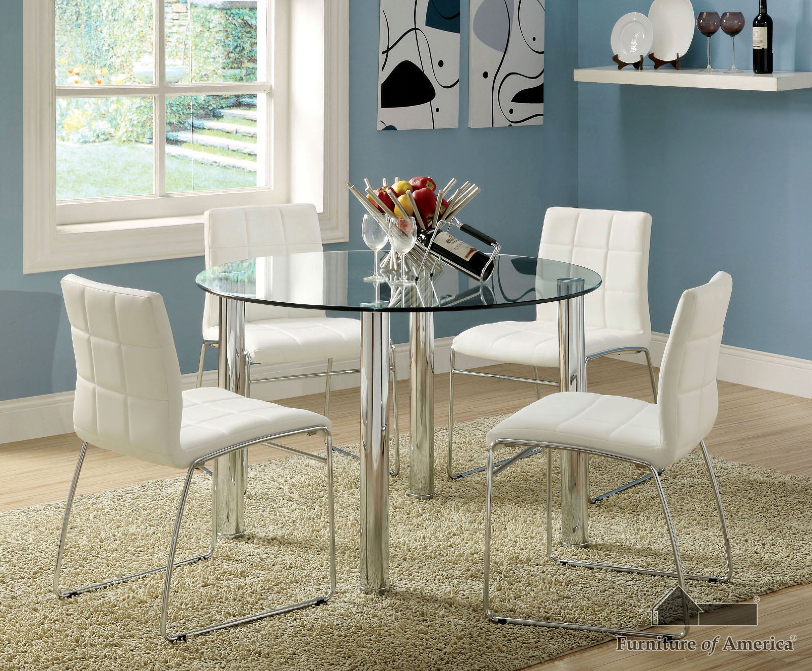 Tempered glass top rests on four solid chrome posts, creating a sleek looking framework for a contemporary dining set. Black or white padded side chairs with thinner chrome legs provide contrast to the bold table legs and create visual interest.