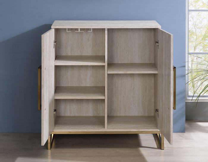 Larkin presents modern elegance in a compact Wine Cabinet/Server. Frameless door hinges offer easy-open elegance to an interior full of function: dual hanging stemware racks, a bottle storage rack and four adjustable shelves. The entire unit is covered in faux marble for an upscale look that will dress up any dining or bar area. Copper colored chrome hardware on pulls and Server base add to the contemporary profile of this functional and beautiful piece.