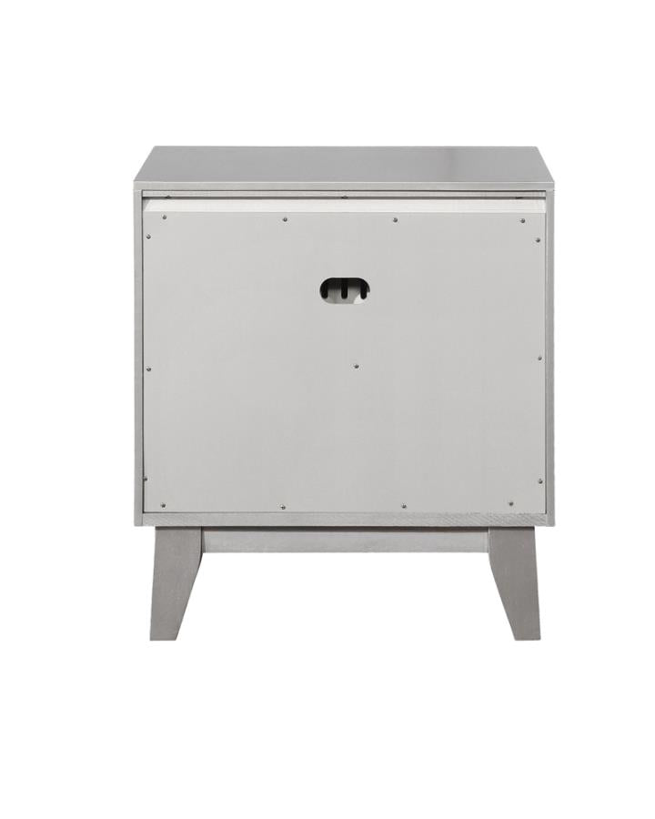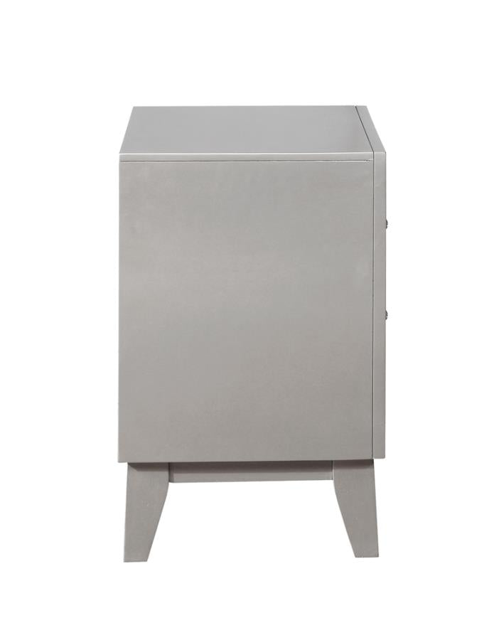 Glamorous and streamlined, this transitional two-drawer nightstand is full of chic details. Great for a stylish bedroom, the sleek silhouette features retro-inspired tapered and angled legs. Full of shine, the drawers feature etched mirror panels that accent the frame work. A radiant metallic mercury finish opens up spaces with glam. Decorate with a mirrored vase or jewelry box for a full-on fashionable look.