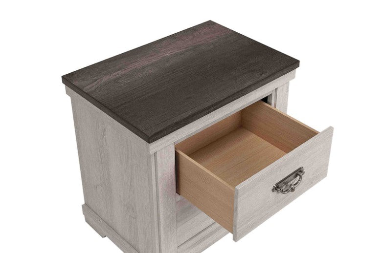 This Leighton Nightstand from Crown Mark is the perfect addition to your bedroom style. With its cottage design and beautiful white finish, it is sure to bring a touch of elegance to your bedroom. Made from durable wood veneers and solids, this nightstand features a unique brown finished top, beveled panel framing, chrome finished handles, decorative hardware and tapered feet. This piece is built to last and is sure to bring your bedroom a colorful touch.