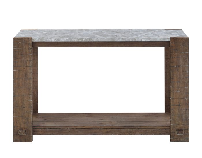- Saw rasp distressing and simulated exposed tenon details blend with an elegant Sintered Stone top in a visually interesting interplay of elegant and casual styling