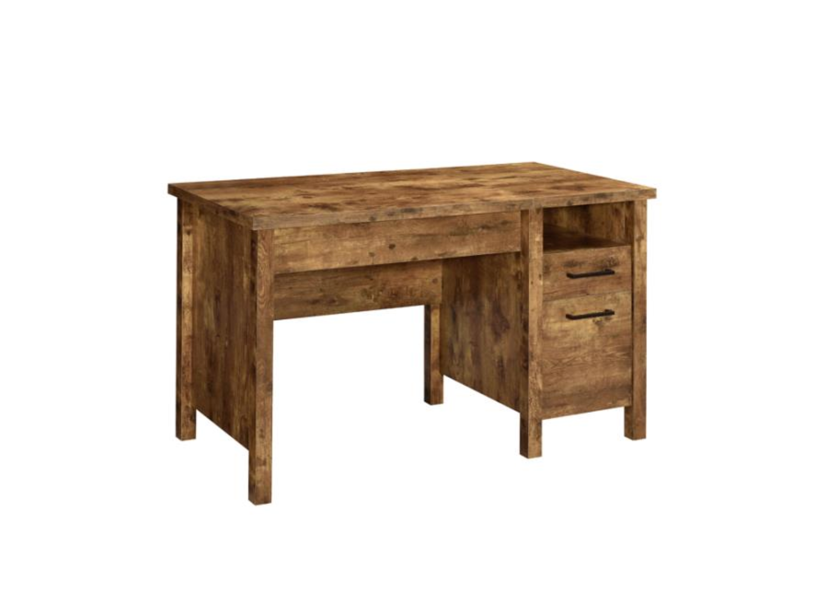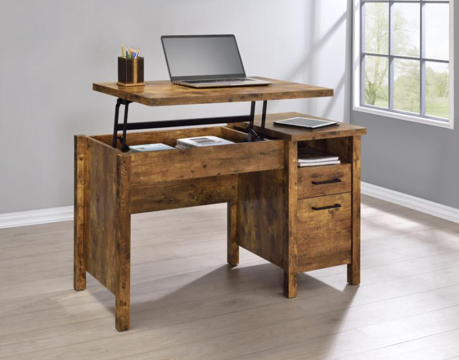 * Rustic office desk with scratch-resistant engineered veneer finished in antique nutmeg * Lift-top reveals abundant storage space and promotes wellness with proper standing height * Features an open cubby, storage drawer, and file cabinet * File cabinet can accommodate letter and legal size files * Constructed with MDF, particle board, and engineered veneer |