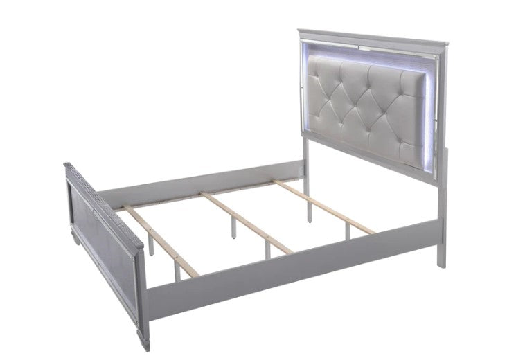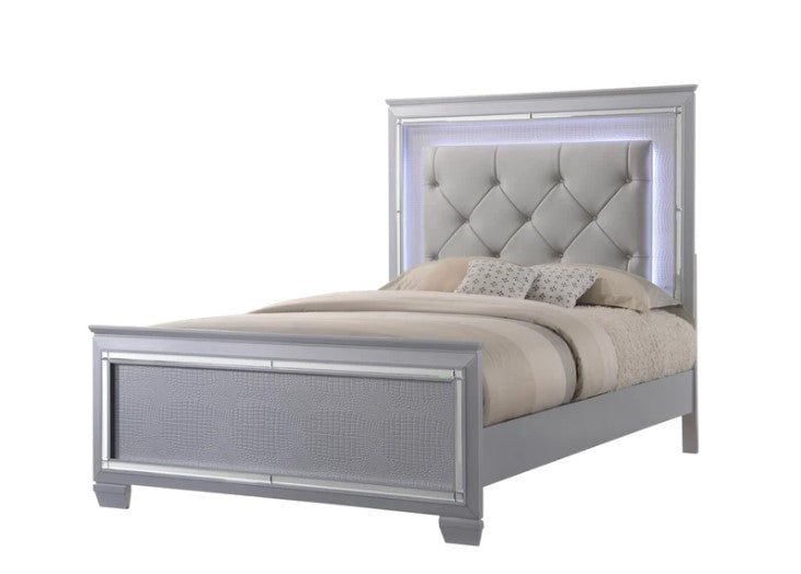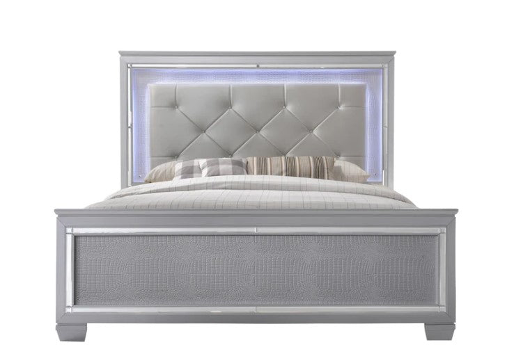 This dazzling bed will be a perfect centerpiece in your glamorous bedroom. Featuring charming details such as beveled mirror accents and a silvery crocodile skin finish, this bed is glam to the max. Relax against the upholstered headboard with diamond tufting, illuminated by a built-in LED backlight. Pair this bed with the nightstand with a night light from this collection for a distinctive bedroom set.