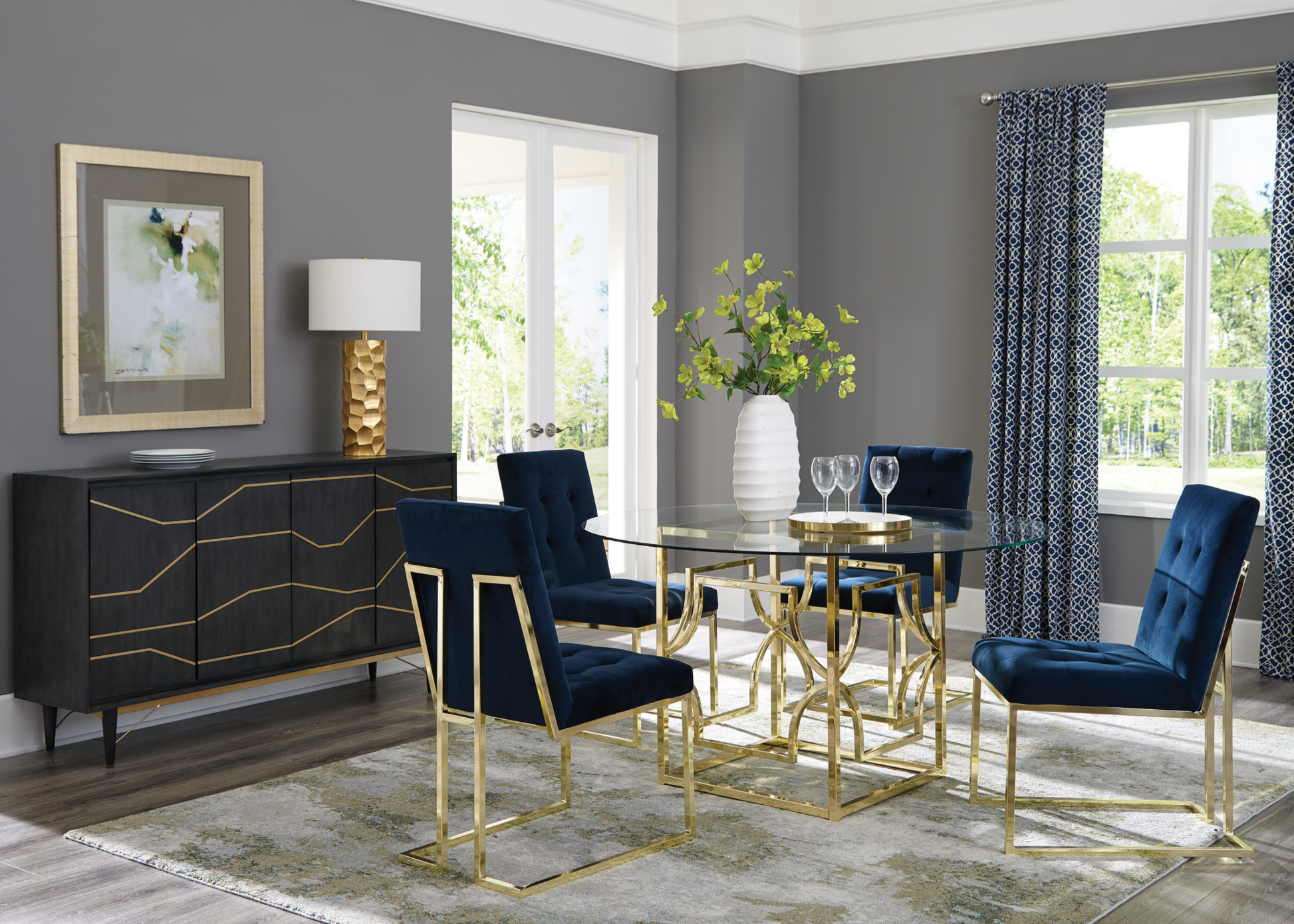 Lindsey Round Glass Top Dining Table Sunny Gold with blue chairs