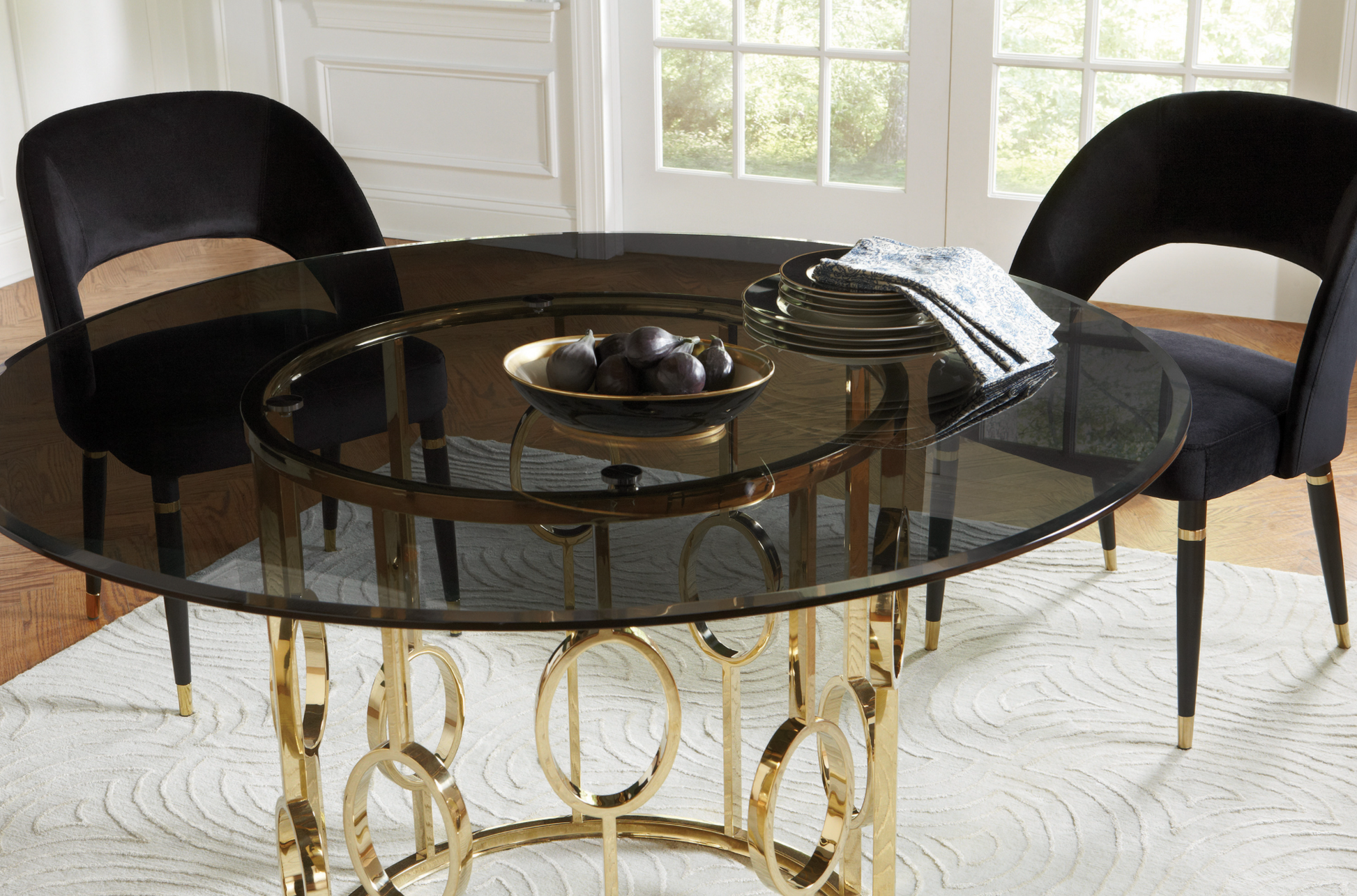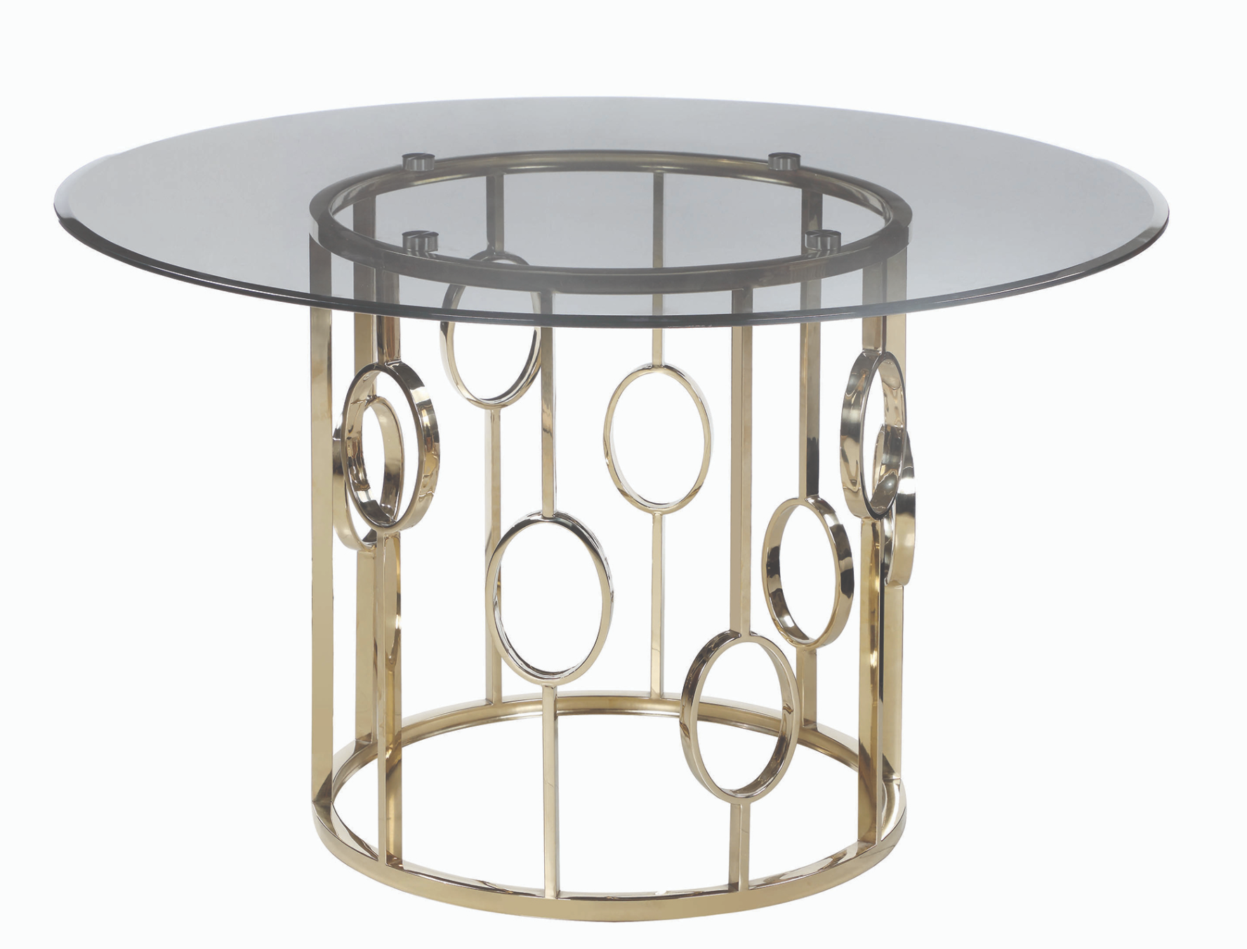 Delightful curves are the name of the game in this striking round dining table. Its drum-style base features open metalwork that shows off a series of ring accents. A luxurious centerpiece, the table is topped with a round of smoke tempered glass that enhances a sophisticated aesthetic. A champagne gold finish is a timeless last touch to this impeccable design. Artful and elegant, this table is just the upgrade you've been searching for.