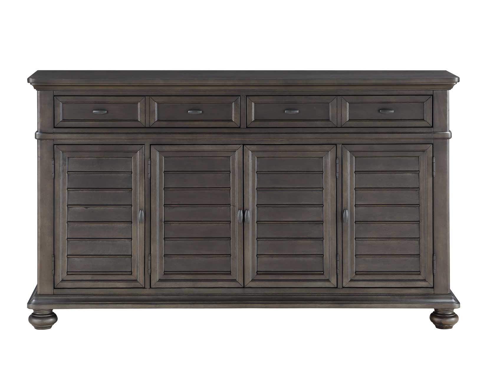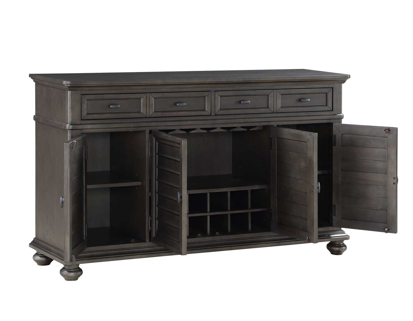 - Updated traditional styling details include nailhead upholstered chairs and web back wooden side chairs, turned table and chair legs and shuttered doors on Server