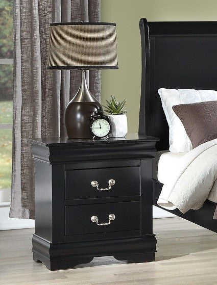 The Louis Philip 2 Drawer Nightstand from Crown Mark is the perfect combination of style and timelessness. It features a clean transitional design with simple lines and a modern black finish, perfect for any décor. Expertly crafted from Asian hardwoods and select veneers, the nightstand features French dovetail drawer fronts for added strength and dustproof bottoms for added durability. With classic Louis inspired style and metal center drawer glides, it is an elegant addition to your home.