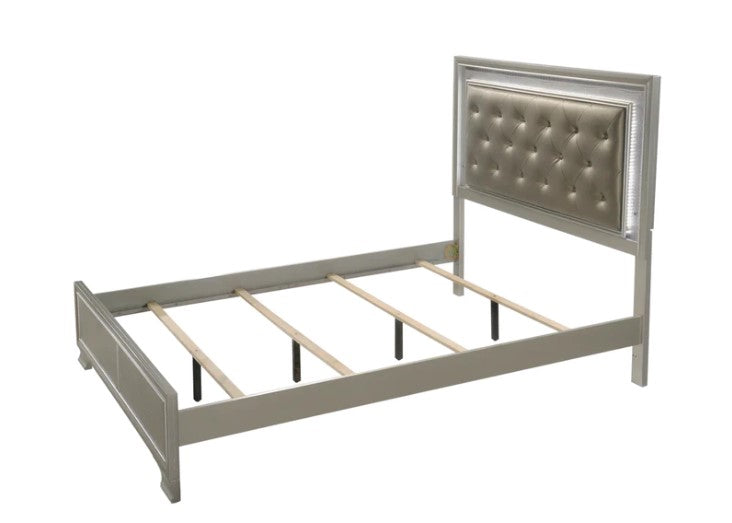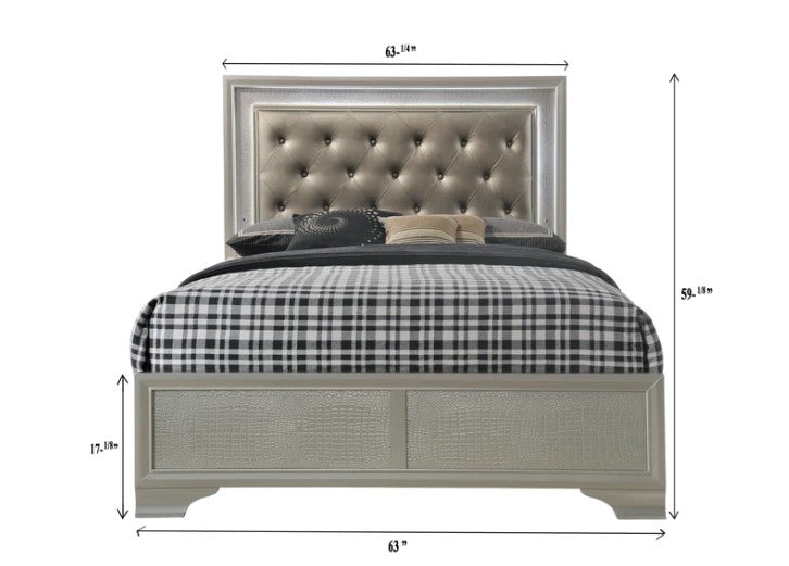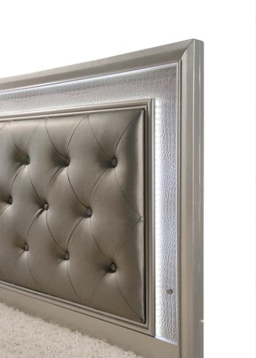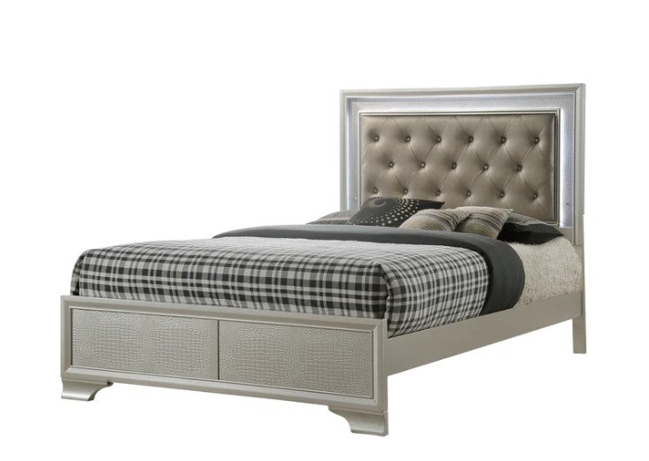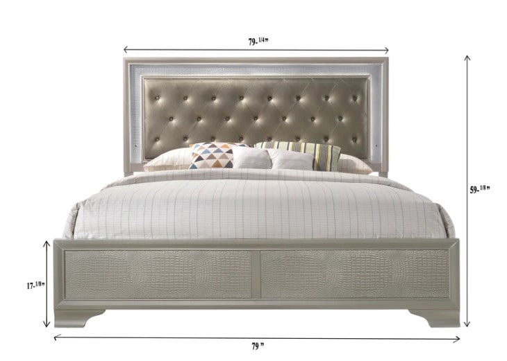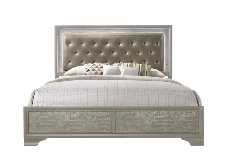 This stunning bed will be a perfect centerpiece in your glamorous bedroom. Featuring a champagne crocodile skin finish, this bed is glam to the max. Relax against the upholstered headboard with diamond tufting illuminated by a built-in LED backlight. Pair this bed with the nightstand with a night light from this collection for a distinctive bedroom set.